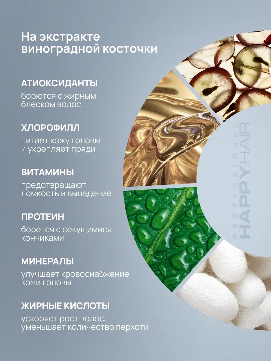 Happy Hair KST (KERASIST) Professional Women's Shampoo. Sulfate-free shampoo with grape seed extract. Grape seed oil contains antioxidants, chlorophyll, vitamins, protein, minerals, and fatty acids – oleic, arachidic, and linoleic. Fights oily hair. Strengthens strands, prevents excessive breakage and hair loss. Nourishes the scalp. Fights split ends. Improves blood circulation to the scalp. Accelerates hair growth. Ideal for hair prone to oiliness. Delicate yet thorough cleansing. Filler is ideal for care after keratin straightening, nanoplasty, lamination, chemical treatments, keratin, and Botox. Normalizes the functioning of hair follicles, restores natural pristine smoothness, reduces breakage, and facilitates combing, ennobling hair with a radiant shine. This sulfate-free, deep-cleansing shampoo is recommended for those who require gentle hair care, especially those with sensitive scalps, and those with curly hair. It eliminates frizz and maintains a bouncy curl for added volume. This specially formulated hair care product restores the structure of your locks, imparting healthy shine and beauty, leaving them silky smooth.