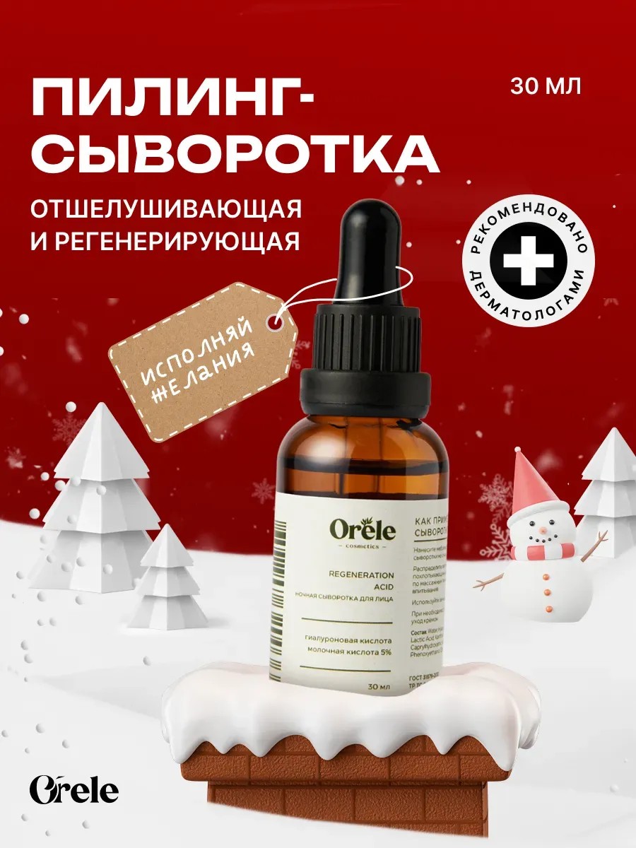 Сыворотка для лица REGENERATION ACID с гиалуроновой кислотой и молочной кислотой подходит для всех типов кожи и оставляет после себя эффект увлажнения и питания. Сыворотка содержит рекомендованную дерматологами концентрацию гиалуроновой кислоты и молочной 5%, которая обладает мощными увлажняющими свойствами. Она способна глубоко проникать в кожу и питать ее изнутри, улучшая уровень увлажненности и оттенок кожи. Также кислотный компонент хорошо борется с шелушениями. При регулярном применении сыворотки, кожа лица становится менее уязвимой к повреждениям.Омоложение, питание, увлажнение, регенерация кожи. Выработка коллагена и восстановление кожного барьера. Против морщин, против акне, против прыщей, от пигментации и постакне. Очень много точек приложения и замечательный эффект. Кожа сияет и благодарит вас! Органическая косметика. Увлажняющая сыворотка для лица. Пилинг, маска, очищение. Профессиональная косметика. Аптечная косметика.Легкая однородная гелевая текстура быстро впитывается, не перегружая кожу, подготавливая ее к нанесению крема и макияжа. Не оставляет белого налета, без ощущения липкости и стянутости кожи. Имеет легкий гипоаллергенный аромат хлопка.Нанесите небольшое количество сыворотки на очищенное лицо. Распределите легкими движениями до полного впитывания. Лучше использовать в вечернее время.При необходимости завершите уход кремом. Подходит для ежедневного использования.Формула разработана настоящими профессионалами, очень скрупулезно и тщательно с заботой о покупателе. Это средство питает и очищает, значительно улучшая качество кожи. Именно поэтому оно подойдет для сухой и зрелой кожи, но возможно использование в качестве профилактики всеми типами кожи, особенно в зимнее время.Используйте данное средство бренда Orele в своем ежедневном уходе, не боясь образования новых проблем. Мы создали средство с любовью и уважением к вам и вашему времени.Наши составы не содержат ничего лишнего- их можно прочесть на одном дыхании! Ваш, Orele