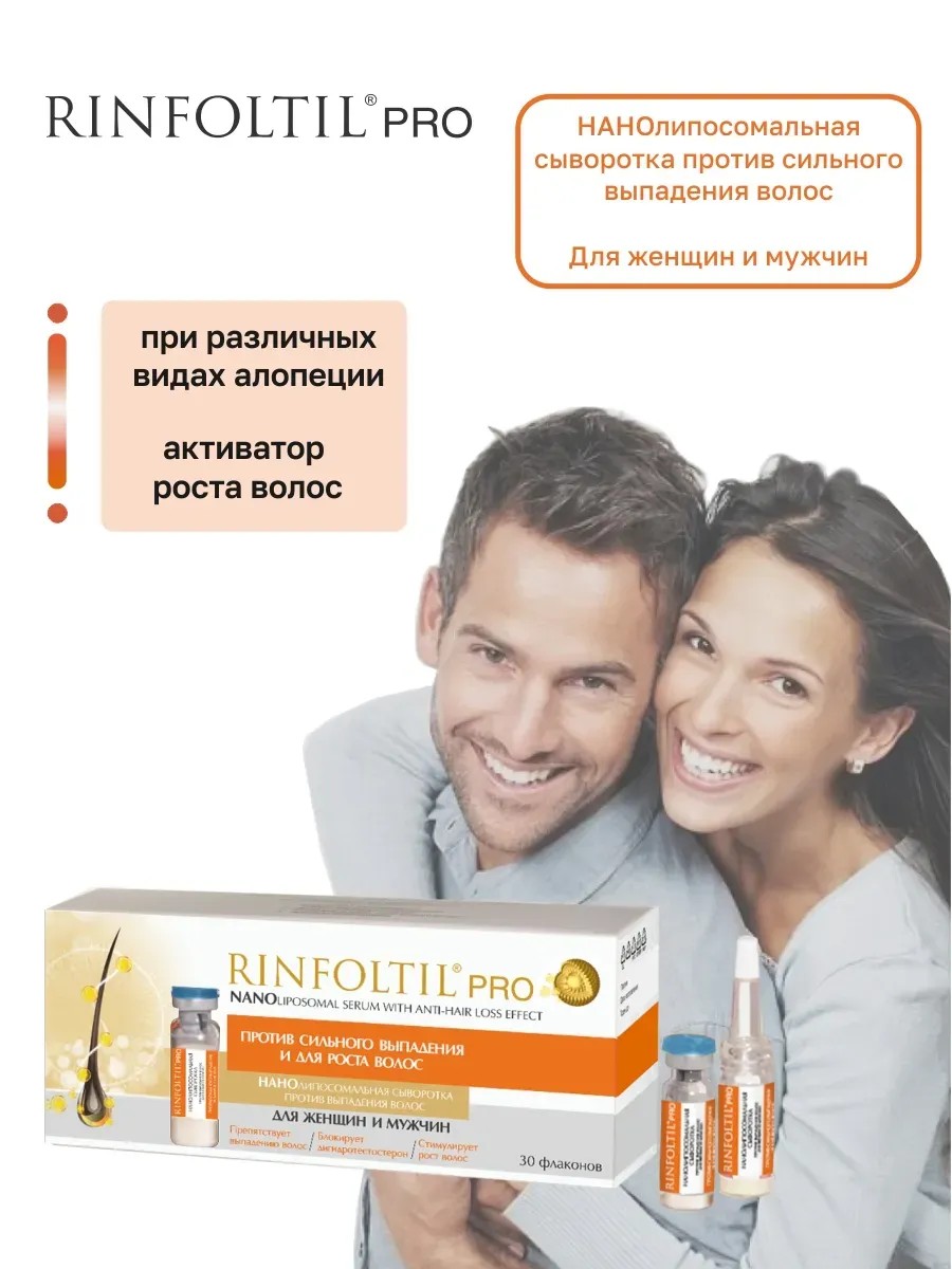 Профессиональная нанолипосомальная сыворотка от выпадения волос у женщин и у мужчин РИНФОЛТИЛ PRO создана на основе научных разработок. Сыворотка для волос РИНФОЛТИЛ PRO действует как активатор роста волос, устраняет физиологические причины выпадения волос, активирует механизмы роста волос, укрепляет структуру волос. Активные компоненты, заключенные внутрь липосом легко проникают в глубокие слои кожи головы. Экстракт пальмы Serenoa Repens (saw palmetto) блокирует активность дигидротестостерона, частую причину выпадения волос у женщин и у мужчин. Цинк РСА препятствует образованию дигидротестостерона, оказывает себорегулирующее действие, обеспечивает глубокое увлажнение и восстановление поврежденных волос. Не влияет на окрашивание и не вызывает потемнения красящего пигмента. Технология лиофилизации (высушивания) позволяет не использовать консерванты.