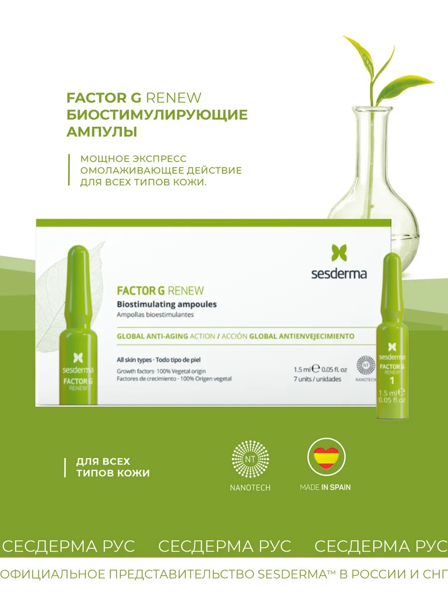 Биостимулирующие ампулы для лица FACTOR G RENEW от испанского бренда Sesderma представляют собой эффективный недельный курс для омоложения, состоящий из семи ампул, каждая из которых содержит девять факторов роста, обеспечивающих мощное омолаживающее действие для кожи.