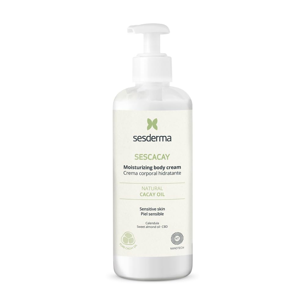 Body cream with emollient, moisturizing, and antioxidant properties. Provides a soothing action and helps improve the appearance of the skin. SAFETY WARNING NoneIs it right for me? Suitable for sensitive skin that needs deep repair and hydration. Furthermore, thanks to its soothing properties, it improves the symptoms of sensitized skin such as redness and dehydration. Ingredients: cacay oil, CBD, HP retinoate, organic silicon, calendula, arnica, sweet almond oil, devil's claw. Directions: Apply the product to cleansed skin, massaging gently until fully absorbed, as often as needed. Benefits: Antioxidant and moisturizing action. Intense nourishment. Soothing properties. Size: 250 ml.Sesderma SESCACAY Crème corporelle hydratante 250 mlDESCRIPTION DU PRODUIT DESCRIPTION DU PRODUIT Crème corporelle aux propriétés émollientes, hydratantes et antioxydantes. Apporte une action apaisante et aide à améliorer l'apparence de la peau du corps. AVERTISSEMENT DE SÉCURITÉ aucuneEst-ce que ça me convient ? Indiqué pour les peaux sensibles qui ont besoin d'une réparation et d'une hydratation en profondeur. En outre, grâce à ses propriétés apaisantes, il améliore les symptômes des peaux sensibilisées comme la rougeur et la déshydratation. Composition : huile de cacay, CBD, HP rétinoate, silicium organique, calendula, arnica, huile d'amande douce, harpagophyte. Mode d'emploi Appliquer le produit sur une peau nettoyée, en effectuant un massage doux jusqu'à absorption complète, autant de fois que nécessaire. Avantages action antioxydante et hydratante. Nutrition intense. Propriétés apaisantes. Taille : 250 ml.