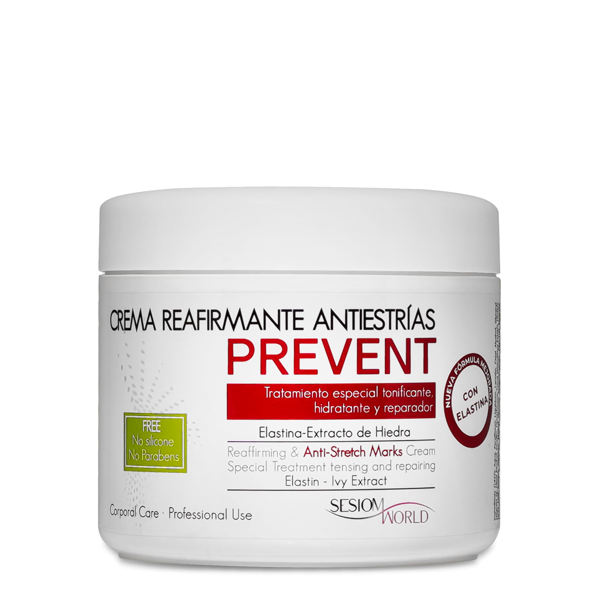 PREVENT Firming Anti-Stretch Mark Cream. Silicone-free, paraben-free. Special toning, moisturizing, and repairing treatment. This highly elastic, soft-textured cream is ideal for body massage and is particularly suitable for areas with stretch marks due to its ivy extract content, which has a pronounced anti-stretch mark effect. Additionally, its Fucus extract content provides a marked toning and firming effect on the skin. To achieve the desired results, apply an appropriate amount and massage in a circular motion until fully absorbed. It is recommended to use 2-3 times per week.Skin type: Dry. Apply an appropriate amount and massage in a circular motion. In addition, thanks to its fucus extract content, it has a marked toning and firming effect on the skin. This cream is ideal for body massage and has a highly elastic, soft texture. It is a firming anti-stretch mark cream silicone-free, paraben-free, and provides a special toning, moisturizing, and repairing treatment.Sesiomworld Crème raffermissante anti-vergetures Prevent 500 ml 1 unité 520 gDESCRIPTION DU PRODUIT Crème PREVENT raffermissante anti-vergetures. Sans silicone, sans paraben. Traitement spécial tonifiant, hydratant et réparateur. Crème indiquée pour le massage corporel de grande extensibilité et texture douce, particulièrement indiquée dans les cas où des vergetures et des vergetures sont présentes en raison de son contenu en extrait de lierre avec effet anti-vergetures marqué. En complément, et par sa teneur en extrait de Fucus, il présente un effet tonifiant et raffermissant marqué du tissu cutané. Pour obtenir le résultat attendu de son utilisation, appliquer une quantité appropriée et effectuer un massage circulaire dans la zone indiquée jusqu'à absorption totale de celui-ci. Il est recommandé d'utiliser 2-3 fois par semaine.Type de peau: Sèche. Appliquer une quantité appropriée et effectuer un massage circulaire. En complément, et par sa teneur en extrait de fucus, il présente un effet tonifiant et raffermissant marqué du tissu cutané. Crème indiquée pour le massage corporel de grande extensibilité et texture douce. Crème raffermissante anti-vergetures sans silicones, sans paraben, traitement spécial tonifiant, hydratant et réparateur.