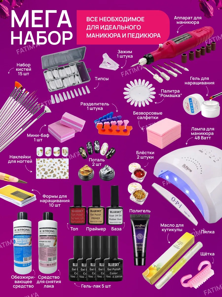 | Комплектация | Лампа для маникюра - 1шт; Топ, база, праймер - 1шт; Набор для маникюра |