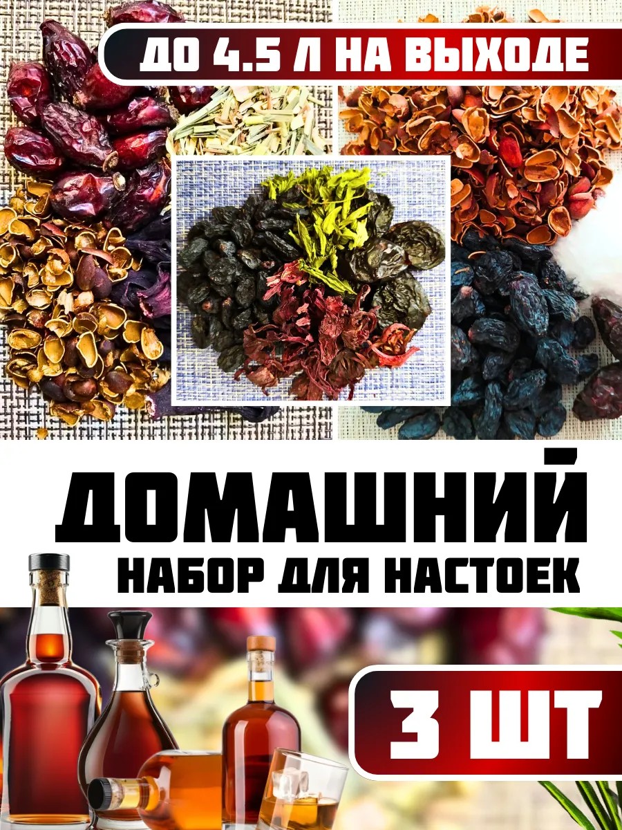ТТри разных набора для приготовления настоек с разными ингредиентами.