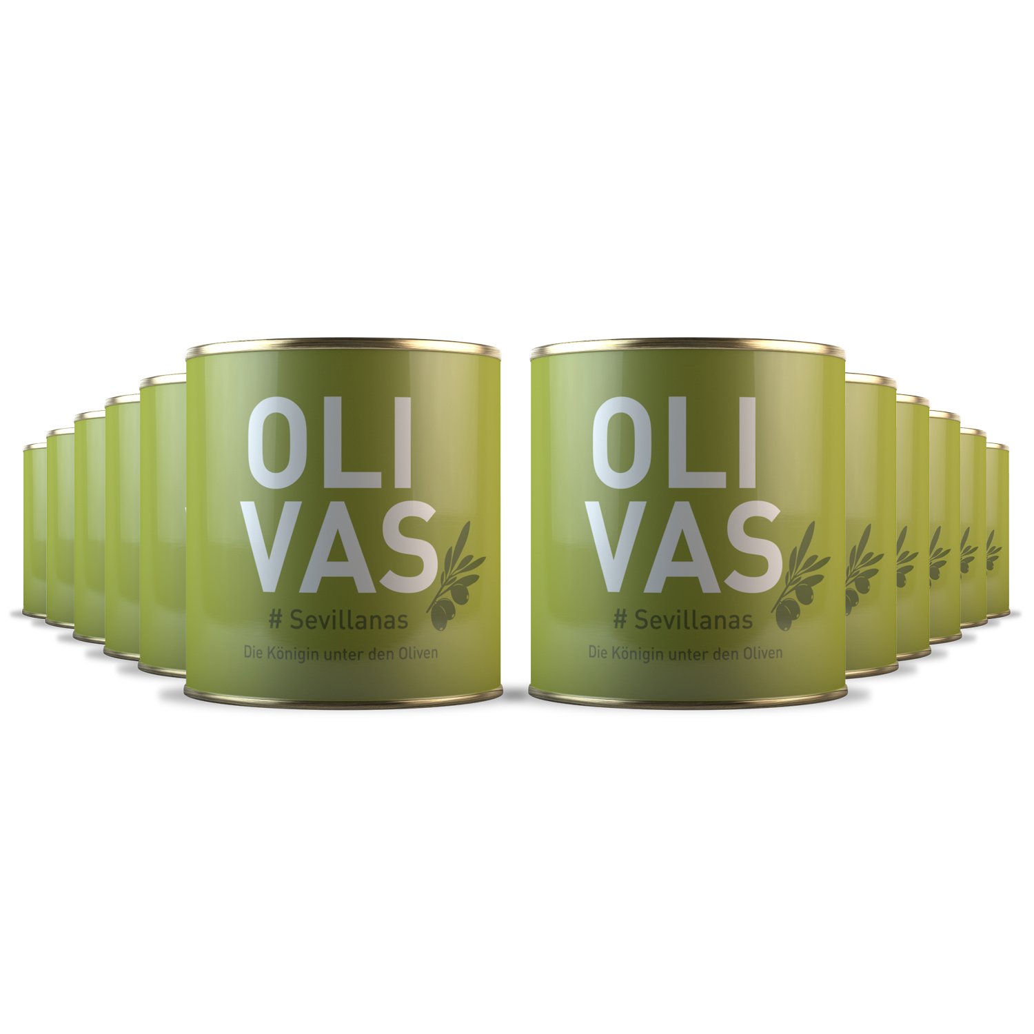 Set of 12 * OLIVAS Sevillanas / 80 g (tin) * Mild Manzanilla olives from Seville * The queen of olives - the original