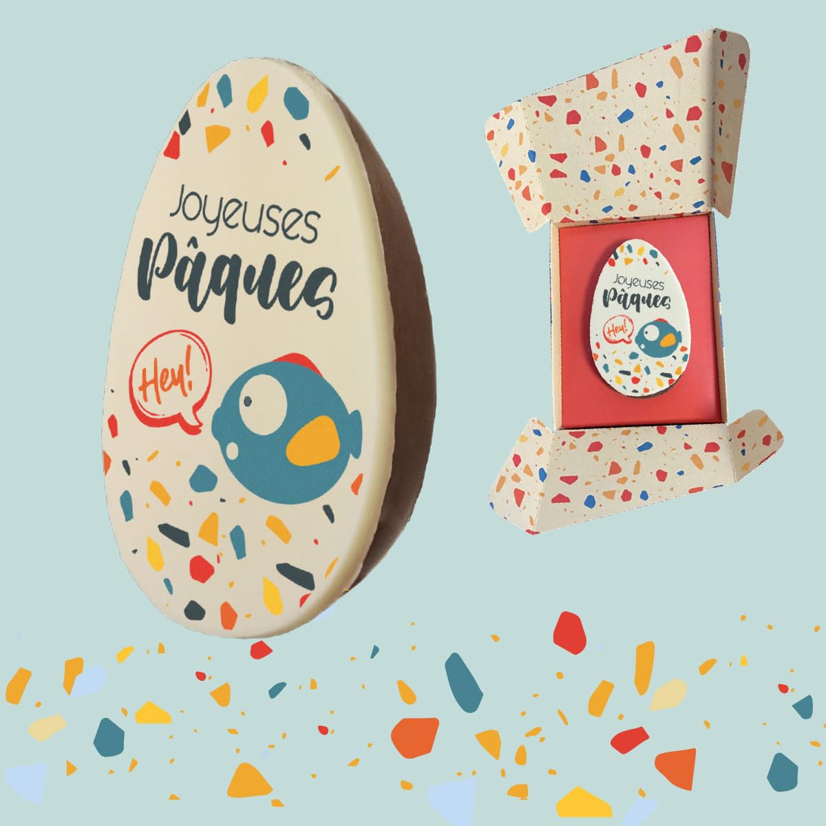 Chocolate couverture 66 cocoa - Cocoa paste - Cocoa butter - Sucrose - Glucose Trimoline - Almond - Hazelnut - Royaltine - Butter - UHT fresh cream - Milk powder - Emulsifier - Soy lecithin - Vanilla flavoringChocodic Master artisan chocolatier for 20 years. Handcrafted in our chocolate factory in Vendée, La Roche-sur-Yon. These chocolate half-eggs are hidden in their cardboard boxes, creating an elegant and festive presentation. The box offers delicate protection, revealing the half-egg and its pretty pattern. Packaged in a 100 recyclable cardboard box. Set of 2 personalized chocolate eggs - Milk chocolate base or milk chocolate depending on the production - Decoration depending on the production - 9x5.5cm - approximately 30g. For Easter, offer a quality chocolate, made by your master artisan chocolatier Chocodic. Couverture chocolat 66 de cacao - Pâte de cacao - Beurre de cacao - Saccharose - Glucose Trimoline - Amande - Noisette - Royaltine - Beurre - Crème fraîche UHT - Poudre de lait - Emulsifiant - Lécithine de soja - Arôme de vanilleChocodic Maître artisan chocolatier depuis 20 ans. Fabriqué de façon artisanale dans notre chocolaterie en vendée à la Roche sur Yon. Ces demi- oeufs en chocolat se cachent dans leurs écrins cartonnés, créant une présentation élégante et festive. L'écrin offre une protection délicate, révélant le demi-oeuf et son joli motif. Emballé dans un coffret cartonné 100 recyclable. lot de 2 Oeufs en chocolat avec personnalisation - Base chocolat lait ou chocolat lait selon fabrication - Décor selon fabrication - 9x5.5cm - environ 30g. Pour Pâques offrez un chocolat de qualité, fabriqué par votre maître artisan chocolatier chocodic.