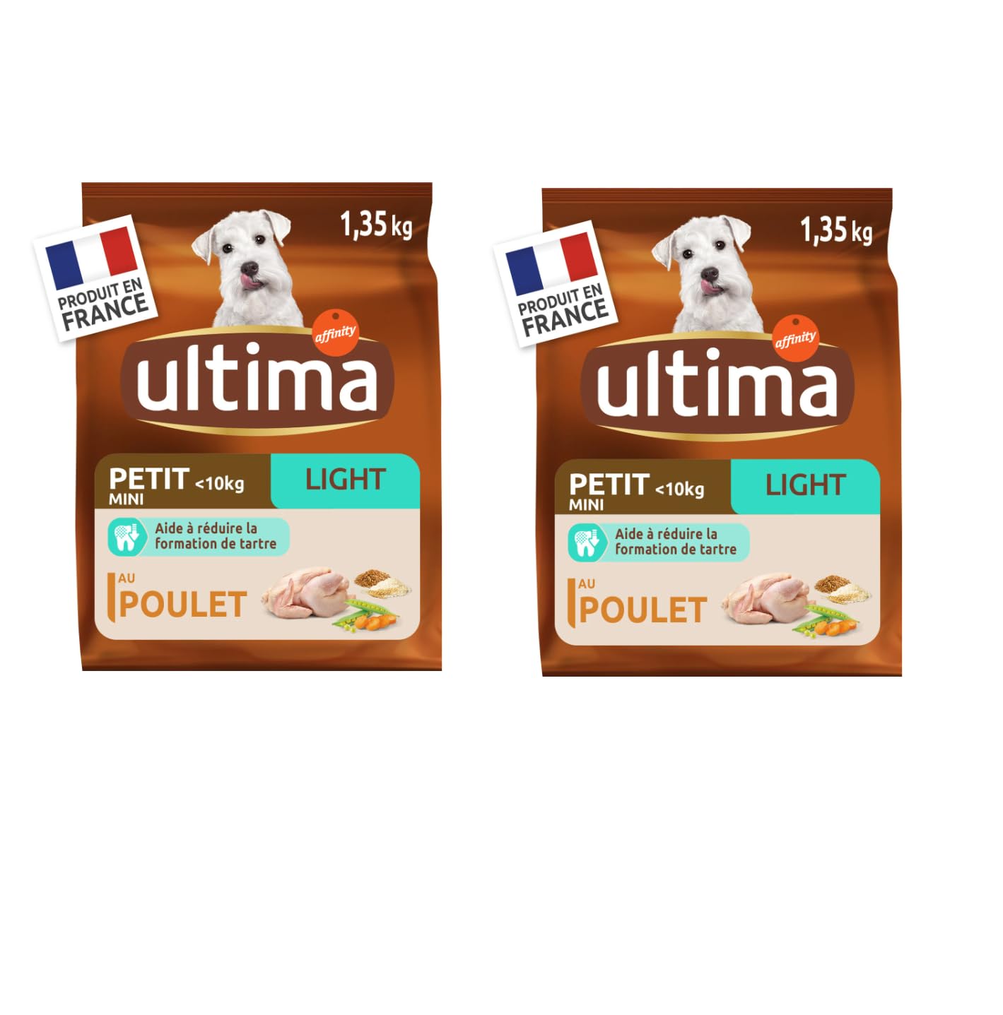 Ultima Mini Light is a recipe adapted to the needs of small dogs (up to 10 kg) likely to gain weight. It contains 44 less fat to help you control weight while maintaining muscle mass. It also helps reduce tartar formation. Compared to Ultima Mini Adult.IngredientsDried poultry protein (14 ), rice (10 ), corn flour, whole wheat (8 ), corn protein, vegetable fiber, dehydrated pork protein, chicken (5 ), whole corn (5 ), dehydrated peas (4 ), SOY protein, hydrolyzed animal proteins, fat of animal origin, beet pulp, minerals (sodium hexametaphosphate 0.6 ), dehydrated carrot (0.5 , equivalent to 4 fresh carrot), sunflower oil. Nutritional additives: Vitamin A 27000 IU vitamin D3 1200 IU vitamin E 650 mg vitamin C 250 mg L-carnitine 250 mg biotin 1 mg, iron(II) sulfate monohydrate 260 mg (Fe: 86 mg) potassium iodide 1.9 mg (I: 1.4 mg) copper(II) sulfate pentahydrate 33 mg (Cu: 8.8 mg) manganese sulfate monohydrate 123 mg (Mn: 40 mg) zinc sulfate monohydrate 405 mg (Zn: 148 mg) sodium selenite 0.2 mg (Se: 0.1 mg). Crude protein: 29 , Crude fat: 9.4 , Crude fiber: 6 , Crude ash: 7.2 , Omega 6: 2.3 Recommended daily ration: Weight of the animal between 1 and 3kg: recommended ration between 25 and 55grs Weight of the animal between 3 and 5kg: recommended ration between 55 and 85grs Weight of the animal between 5 and 10kg: recommended ration between 85 and 140grs Dehydrated poultry proteins (14 ), rice (10 ), corn flour, whole wheat (8 ), corn protein, vegetable fiber, dehydrated pork proteins, chicken (5 ), whole corn (5 ), dehydrated peas (4 ), SOY protein, hydrolyzed animal proteins, fat of animal origin, beet pulp, mineral substances (sodium hexametaphosphate 0.6 ), carrot INGREDIENTS chicken pork wheat DIRECTIONS FOR USE Recommended daily intake Weight of the animal between 1 and 3kg: recommended ration between 25 and 55grs Weight of the animal between 3 and 5kg: recommended ration between 55 and 85grs Weight of the animal between 5 and 10kg: recommended ration between 85 and 140grs ULTIMA LIGHT SPECIAL DOG LESS THAN 0.1 KGS. Ultima Mini Light est une recette adaptée aux besoins des chiens de petite taille (jusqu'à 10 kg) susceptibles de prendre du poids. Elle contient 44 de matières grasses en moins pour vous aider à contrôler son poids tout en conservant sa masse musculaire. Elle aide également à réduire la formation de tartre. Comparé à Ultima Mini Adulte.IngrédientsProtéines déshydratées de volaille (14 ), riz (10 ), farine de maïs, blé complet (8 ), protéine de maïs, fibre végétale, protéines déshydratées de porc, poulet (5 ), maïs complet (5 ), pois déshydratés (4 ), protéine de SOJA, protéines animales hydrolysées, graisse d'origine animale, pulpe de betterave, substances minérales (hexamétaphosphate de sodium 0,6 ), carotte déshydratée (0,5 , équivalent à 4 de carotte fraîche), huile de tournesol. Additifs nutritionnels : Vitamine A 27000 UI vitamine D3 1200 UI vitamine E 650 mg vitamine C 250 mg L-carnitine 250 mg biotine 1 mg, sulfate de fer(II) monohydraté 260 mg (Fe : 86 mg) iodure de potassium 1,9 mg (I : 1,4 mg) sulfate de cuivre(II) pentahydraté 33 mg (Cu : 8,8 mg) sulfate de manganèse monohydraté 123 mg (Mn : 40 mg) sulfate de zinc monohydraté 405 mg (Zn : 148 mg) sélénite de sodium 0,2 mg (Se : 0,1 mg). Protéines brutes : 29 , Matières grasses brutes : 9,4 , Cellulose brute : 6 , Cendres brutes : 7,2 , Oméga 6 : 2,3 Ration journalière recommandée : Poids de l'animal entre 1 et 3kg : ration recommandée entre 25 et 55grs Poids de l'animal entre 3 et 5kg : ration recommandée entre 55 et 85grs Poids de l'animal entre 5 et 10kg : ration recommandée entre 85 et 140grs Protéines déshydratées de volaille (14 ), riz (10 ), farine de maïs, blé complet (8 ), protéine de maïs, fibre végétale, protéines déshydratées de porc, poulet (5 ), maïs complet (5 ), pois déshydratés (4 ), protéine de SOJA, protéines animales hydrolysées, graisse d'origine animale, pulpe de betterave, substances minérales (hexamétaphosphate de sodium 0,6 ), carotte INGRÉDIENTS poulet porc blé MODE D'EMPLOI Ration journalière recommandée Poids de l'animal entre 1 et 3kg : ration recommandée entre 25 et 55grs Poids de l'animal entre 3 et 5kg : ration recommandée entre 55 et 85grs Poids de l'animal entre 5 et 10kg : ration recommandée entre 85 et 140grs ULTIMA LIGHT SPECIAL CHIEN INFERIEUR 0 1 KGS.