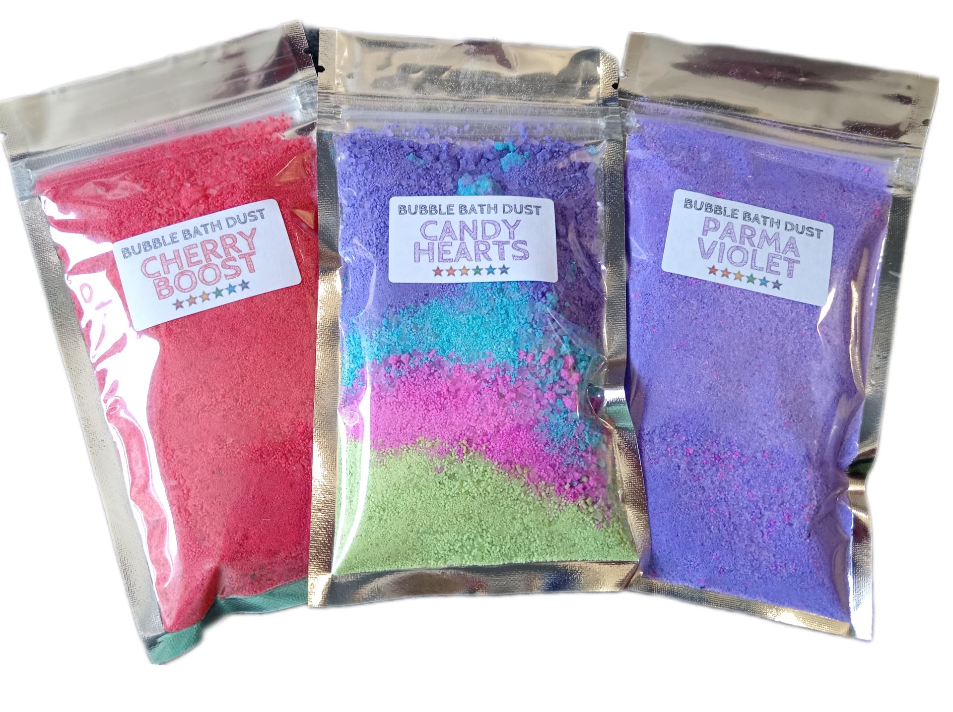 Handmade in UK - CPSR (Safety Product Safety Report) Held For All Products. Candy Hearts. Cherry Boost. Parma Violet. Set of 3 Sweet Smelling Bubble Bath Dust.