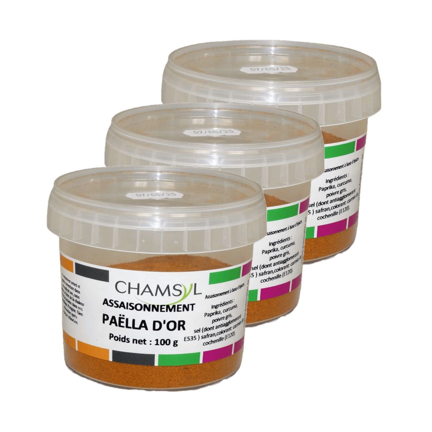 This lot contains 3 products described below: Prepare one of the greatest classics of Spanish cuisine according to the rules of the art with this paella mix. It is a homogeneous combination of paprika, turmeric, pepper and saffron. This mixture for paella offers a subtle and flavored character to your dishes, for a most exquisite tasting experience. Packaged in France. Ingredients : Paprika, turmeric, gray pepper, salt, saffron, coloring. Allergens: None Storage method: Store at room temperature, away from heat and humidity before opening. Directions for use: Store preferably in its tightly closed packaging, in a covered place, cool, dry and protected from light. Product information: Net weight: 100g Origin: Spain Energy: 1249KJ 299Kcal Lipids: 11.2g including saturated fatty acids 2.3g Carbohydrates: 56.3g including sugars 13g Protein: 7.6g Dietary fiber: g Salt: 3.16g Packaging: Plastic jar Full details available on the product packaging. The information on this page is for information purposes only. We encourage you to read the information on the product label, particularly regarding food allergies. INGREDIENTS Paprika, turmeric, gray pepper, salt, saffron, coloring. SAFETY WARNING Full details available on the product packaging. The information on this page is for information purposes only. We encourage you to read the information on the product label, particularly regarding food allergies. Vegan - Cuisine: Spanish. Gluten-free, Lactose-free, No added sugar, No preservatives. Large packaging. Allergen list: None. Ingredients: Paprika, turmeric, black pepper, salt, saffron, coloring. Ce lot contient 3 produits décrits ci-dessous : Préparez l'un des plus grands classiques de la cuisine espagnole dans les règles de l'art avec ce mélange pour paëlla. C'est un ensemble homogène de paprika, de curcuma, de poivre et de safran. Ce mélange pour paëlla offre un caractère subtil et aromatisé, à vos plats, pour une dégustation des plus exquises. Conditionné en France. Ingrédients : Paprika, curcuma, poivre gris, sel, safran, colorant. Allergènes : Aucun Mode de conservation : A conserver à température ambiante, à l'abri de la chaleur et de l'humidité avant ouverture. Conseil d'utilisation : A conserver de préférence dans son emballage hermétiquement fermé, dans un local couvert, au frais, au sec et à l'abri de la lumière. Informations produit : Poids net : 100g Origine : Espagne Energie : 1249KJ 299Kcal Lipides : 11,2g dont acides gras saturés 2,3g Glucides : 56,3g dont sucres 13g Protéines : 7,6g Fibres alimentaires : g Sel : 3,16g Emballage : Pot en Plastique Détail complet et disponible sur l'emballage du produit. Les informations présentes sur cette page sont à titre indicatif. Nous vous invitons à prendre connaissance des informations sur l'étiquette du produit, en particulier concernant les allergies alimentaires. INGRÉDIENTS Paprika, curcuma, poivre gris, sel, safran, colorant. AVERTISSEMENT DE SÛRETÉ Détail complet et disponible sur l'emballage du produit. Les informations présentes sur cette page sont à titre indicatif. Nous vous invitons à prendre connaissance des informations sur l'étiquette du produit, en particulier concernant les allergies alimentaires. Végan - Type de cuisine : Espagnole. Sans gluten Sans lactose Sans sucre ajouté Sans conservateur. Gros conditionnement. Liste des allergènes : Aucun. Liste des ingrédients : Paprika, curcuma, poivre gris, sel, safran, colorant.