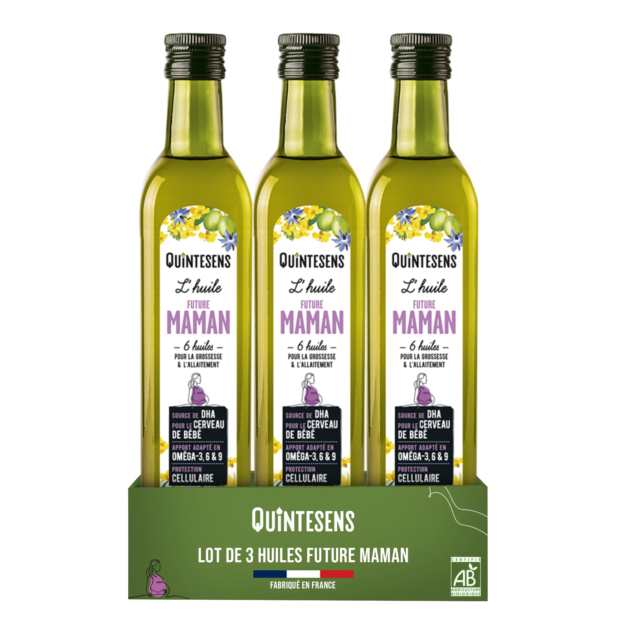 Authentic Commitment: At QUINTESENS, we are committed to providing you with superior quality products, carefully developed by nutrition experts, while respecting the environment and your well-being. Join us for a gourmet and uncomplicated health experience!. Versatile Daily Use: Ideal for enhancing savory or sweet dishes: salads, vegetables, soups, or even smoothies. A practical ally for a varied and balanced diet during pregnancy. 100 French Production: Made in France with carefully selected ingredients from quality terroirs, our oils benefit from AB certification which guarantees their organic and environmentally friendly nature. Rich in Key Nutrients: Covers the necessary intake of Omega 3, 6, 9, DHA and Vitamin E, essential for the mother's health and the proper brain and visual development of the baby. Specially Formulated for Expectant Mothers: An oil designed by nutritionists to support the unique nutritional needs of pregnant women and support the baby's development.Engagement Authentique: Chez QUINTESENS, nous nous engageons à vous fournir des produits de qualité supérieure, élaborés avec soin par des experts en nutrition, tout en respectant l'environnement et votre bien-être. Rejoignez-nous pour une expérience santé gourmande et sans complexe !. Utilisation Polyvalente au Quotidien : Idéale pour rehausser les plats salés ou sucrés : salades, légumes, soupes, ou même smoothies. Un allié pratique pour une alimentation variée et équilibrée pendant la grossesse. Production 100 Française: Fabriquées en France avec des ingrédients soigneusement sélectionnés provenant de terroirs de qualité, nos huiles bénéficient d'une certification AB qui garantit leur caractère biologique et respectueux de l'environnement. Richesse en Nutriments Clés : Couvre les apports nécessaires en Oméga 3, 6, 9, DHA et Vitamine E, essentiels pour la santé de la maman et le bon développement cérébral et visuel du bébé. Spécialement Formulée pour les Futures Mamans : Une huile conçue par des nutritionnistes pour accompagner les besoins nutritionnels uniques des femmes enceintes et soutenir le développement du bébé.