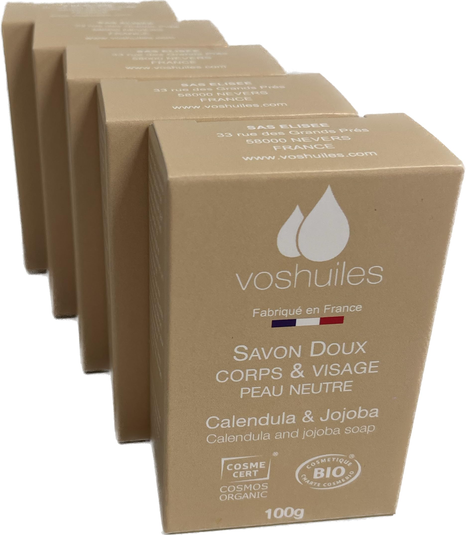 COSMOS Roman Chamomile Floral Water is composed of a 100 pure and natural hydrosol and a preservative that ensures product stability. Cosmetic-grade, it releases a light and delicate fragrance.Composition: Water, Glycerin, Sunflower vegetable oil, Refined olive vegetable oil, Refined copra vegetable oil (coconut pulp), Shea butter, Virgin castor oil, Calendula macerate, Virgin jojoba vegetable oil. 5 soaps of 100gr, cream color, soft, superfatted and fragrance-free. To be used within 18 months after opening. Use: Apply to damp or wet skin. Lather it in your hands and apply to the part of the body to be washed. Rinse thoroughly with clean water after application. Dry the soap after use in a ventilated area. This soap is composed of quality vegetable oils and made by cold saponification in order to keep the natural glycerin which allows a soft and creamy touch, and which is known for its moisturizing quality. This superfatted soap corresponds to neutral skin and can be applied to the body, face and hands. Set of 5 Calendula and Jojoba Soaps for neutral skin. L'eau florale de camomille romaine COSMOS est composée d'un hydrolat 100 pur et naturel et d'un conservateur qui permet la stabilité du produit. De qualité cosmétique, elle dégage un parfum léger et délicat.Composition : Eau, Glycérine, Huile végétale de tournesol, Huile végétale d'olive Raffinée, Huile végétale de coprah Raffinée ( pulpe de noix de coco), Beurre de Karité, Huile de ricin vierge, Macérât de Calendula, Huile végétale de Jojoba vierge. 5 Savons de 100gr, couleur crème, doux, surgras et sans parfum. A utiliser dans les 18 mois après ouverture. Utilisation : Appliquer sur une peau humide ou mouillée. Le faire mousser dans les mains et appliquer sur la partie du corps à laver. Rincer abondamment à l'eau claire après application. Faire sécher le savon après utilisation dans un endroit aéré. Ce savon est composé d'huiles végétales de qualité et fabriqué par saponification à froid afin de garder la glycérine naturelle qui permet un toucher doux et onctueux, et qui est connue pour sa qualité hydratante. Ce savon surgras corresponds aux peaux neutres et s'applique aussi bien sur le corps, le visage, les mains. Lot de 5 Savons Calendula et Jojoba pour peau neutre.