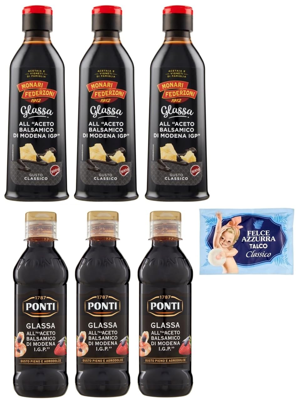 Set of 6 Monari Federzoni Test Packets 300g + Ponti 250g Glassa all'Aceto Balsamico di Modena Ice Cream with Balsamic Vinegar of Modena I.G.P. + 1 x Felce Azzurra Talcum Powder 100g
