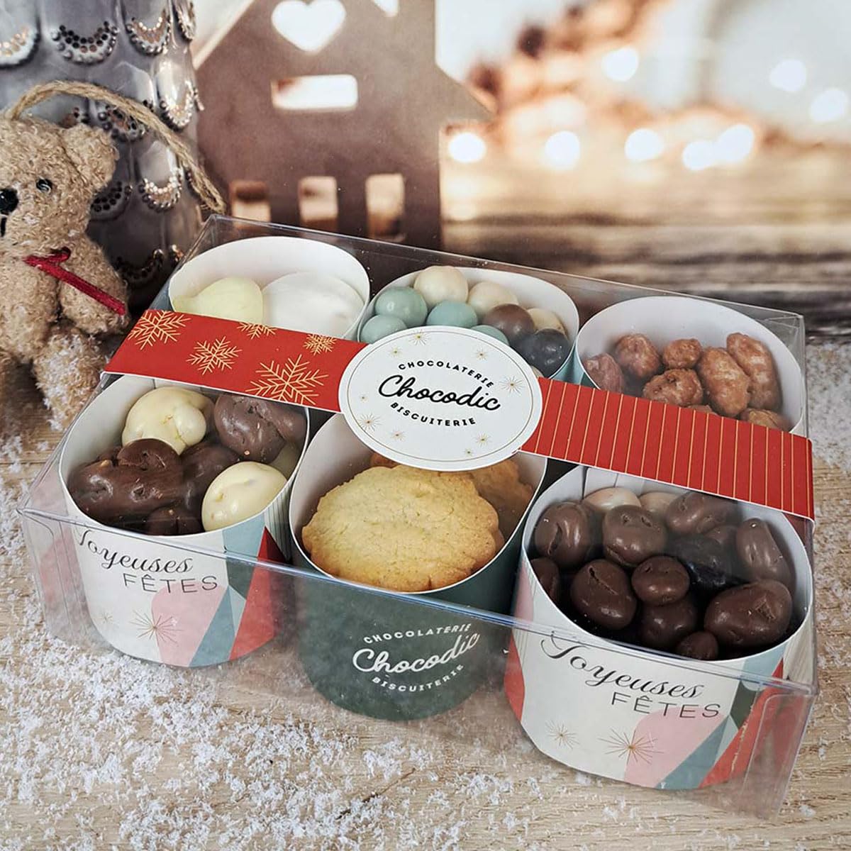 A transparent box with 6 cups containing delicious chocolate-coated marshmallows, butter cookies, crispy balls (cereal balls coated in chocolate), roasted peanuts, mogettes (a nougatine heart coated in chocolate) and marshmallows. This is the box to offer for the holidays or to place on the table to enjoy with family or friends. 350g – 13x17x6cmAll of our products are made in our 100 artisanal family business (no artificial colors or preservatives), in an eco-responsible approach through our cocoa producers who are committed to sustainable farming. 350g – 13x17x6cm. This is the perfect gift for the holidays or to place on the table to enjoy with family or friends. A transparent box with 6 cups containing delicious chocolate-coated marshmallows, butter cookies, croustybilles (cereal balls coated in chocolate), roasted peanuts, mogettes (a nougatine heart coated in chocolate) and marshmallows. Un coffret transparent avec 6 timbales contenant de savoureuses guimauves enrobées de chocolat dragéifiées, des galettes au beurre, des croustybilles (billes de céréales enrobées de chocolat), des cacahuètes grillées, des mogettes (un coeur nougatine enrobé de chocolat) et des guimauves. C'est le coffret à offrir pour les fêtes ou à disposer sur la table pour le déguster en famille ou entre amis. 350g – 13x17x6cmL'intégralité de nos produits sont fabriqués au sein de notre entreprise familiale 100 artisanale (sans colorants ni conservateurs), dans une démarche éco-responsable au travers de nos producteurs de cacao qui s'inscrivent dans une action de culture durable. 350g – 13x17x6cm. C'est le coffret à offrir pour les fêtes ou à disposer sur la table pour le déguster en famille ou entre amis. Un coffret transparent avec 6 timbales contenant de savoureuses guimauves enrobées de chocolat dragéifiées, des galettes au beurre, des croustybilles (billes de céréales enrobées de chocolat), des cacahuètes grillées, des mogettes (un coeur nougatine enrobé de chocolat) et des guimauves.