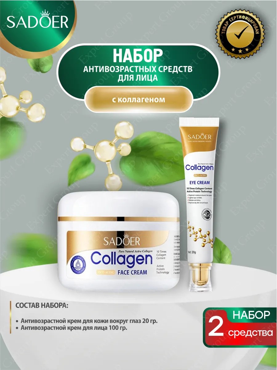 | Комплектация | Набор антивозрастных кремов Sadoer с коллагеном Для кожи вокруг глаз 20 гр + Для лица 100 гр |