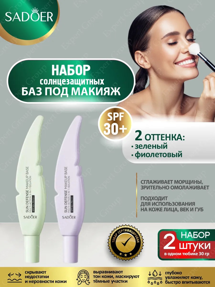 Sadoer Sunscreen Makeup Base Set, Green + Purple, 30g each. The set includes: Sadoer Moisturizing Sunscreen Makeup Base SPF30+ PA+++, Green, 30g, and Sadoer Multifunctional Makeup Base with Sun Protection SPF30+ PA+++, Purple, 30g. Sunscreen bases help keep makeup looking long-lasting, conceal minor imperfections, redness, and flaking, and camouflage an unhealthy complexion. They fill in enlarged pores and fine lines, smooth out wrinkles, and visibly rejuvenate the face. These makeup bases absorb quickly without leaving a sticky, filmy, or uncomfortable feeling, allowing foundation, powder, or cushion to adhere smoothly. They can be applied to eyelids to ensure eyeshadow goes on smoothly and makeup stays on longer. They can also be applied to lips to fill in microcracks and create a perfectly smooth surface. For the face – to moisturize and smooth the skin's micro-relief for subsequent makeup application. Directions: Apply the base evenly over the entire face and neck. Reapply throughout the day.