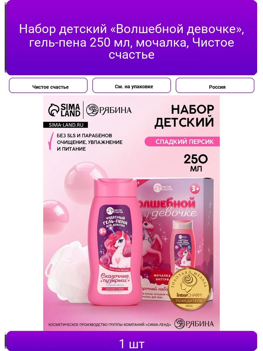 | Комплектация | Набор детский «Волшебной девочке», гель-пена 250 мл, мочалка, Чистое счастье |