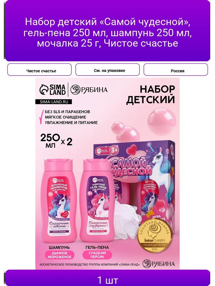 | Комплектация | Набор детский «Самой чудесной», гель-пена 250 мл, шампунь 250 мл, мочалка 25 г, Чистое счастье |