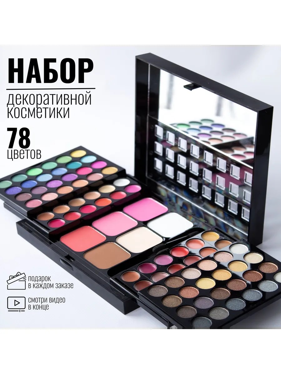 professional makeup artist's makeup set in a black folding gift case. Contains 78 shades: 48 eyeshadows, 18 lip glosses, 2 blushes, 1 DD cream, 3 restorative powders, and 6 foundations/concealers. A large mirror and brushes are included. This makeup set is ideal for both professional makeup artists and beginners. Formulated with minerals, it is suitable for sensitive skin. The compact case is convenient for home use, travel, and work. It makes a wonderful gift for women, girls, and teenagers for any occasion: birthdays, New Year's, March 8th, and February 14th. Key Features: Type: Decorative Cosmetics Set Color: Multicolored Area of Use: Face, Eyebrows, Lips Composition Features: Fragrance-Free Shade Feature: Radiant Target Audience: Adults, Children Units in One Product: 1 Number of Shades in the Set: 78 Packaging: Gift Wrapping, Plastic Case Country of Origin: China