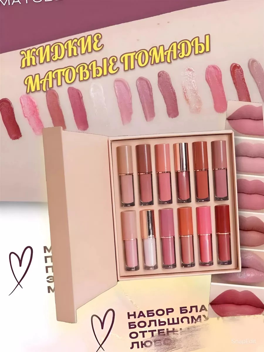 Помада для губ, набор из 12 приятных оттенков: 10 матовых помад и 2 блеска. Питают и увлажняют кожу губ. Обеспечивают идеальное покрытие, не скатываются, очень стойкие. Макияж будет подчеркнутым и аккуратным. Помады красиво очерчивают линию губ и делают лицо выразительным. Набор жидких матовых помад с инновационной формулой, которая скользит по губам, как блеск, но высыхает до ультраматовой, непрозрачной текстуры. Помада стойко держится, не высушивает кожу и не скатывается. Аппликатор специальной формы обеспечивает легкое и точное нанесение. Для идеального результата сначала обведите контур губ кончиком аппликатора, а затем заполните весь объем губ. Наносить жидкую помаду можно как отдельно, так и в сочетании с контурным карандашом. Однородная текстура и яркий пигмент помогут создать неповторимый и яркий образ. Найти помады можете по таким запросам: Маска косметика лица набор помада масло бальзам карандаш гигиеническая подарочный увлажняющая корейская глаз стики уход женский корея девочек подводка косметический новогодний детские жидкая сладкий матовая подарок макияжа блестками контуринг консилер уходовая дорожный увеличения пигмент нюд гель декоративная прозрачный губная ночная черный корректор стик кожи касметика розовый флюид стойкая натуральная девушек доя средство набор красного цвета розового на водной основе вино тинто гелевый полупрозрачный оттенок эффект зацелованных губ ухаживающий увлажняющий питательный стойкий яркий матовое покрытие средство текстура пленка уходовая косметика Корея для лица