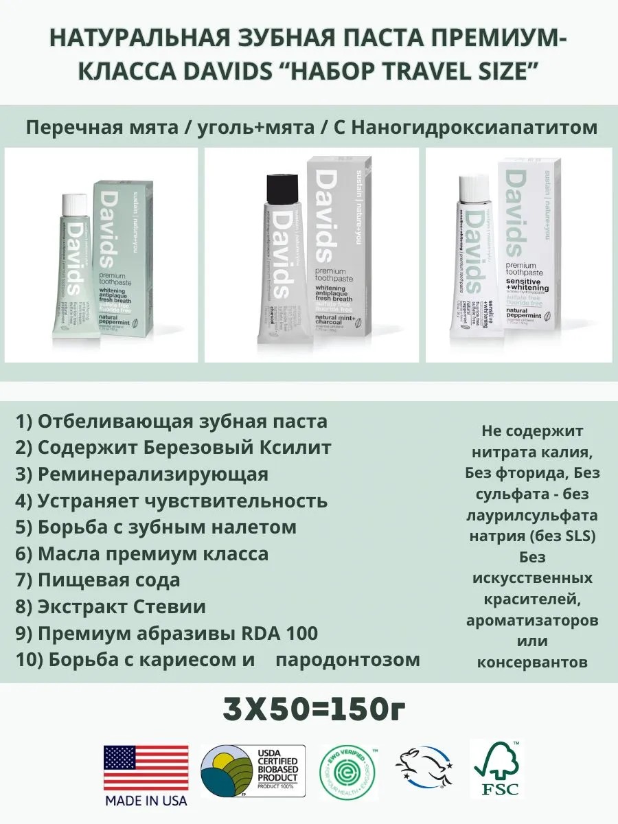 Набор натуральных зубных паст Davids премиум класса — это идеальный выбор для тех, кто заботится о здоровье и красоте своей улыбки. В набор входят 3 пасты размер для путешествий с восхитительными вкусами: Уголь плюс мята, Перечная мята, Наногидроксиапатит (n-HA) перечная мята . Каждая паста создана из натуральных ингредиентов и обеспечивает комплексный уход за полостью рта, освежает дыхание и бережно отбеливает эмаль. Davids Toothpaste — это забота о вашей улыбке, вдохновленная природой.