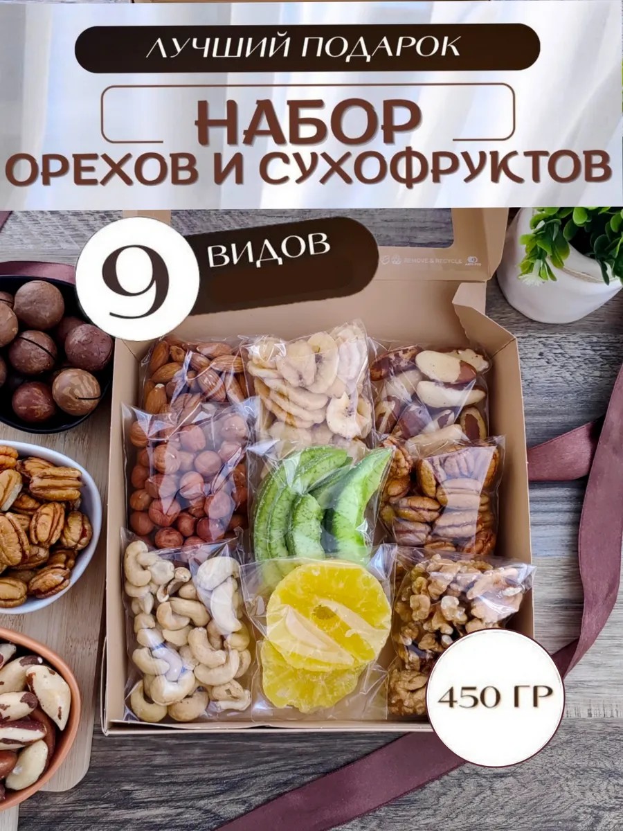 | Комплектация | орехи 9 видов; подарочная лента; подарок; подарочная коробка |