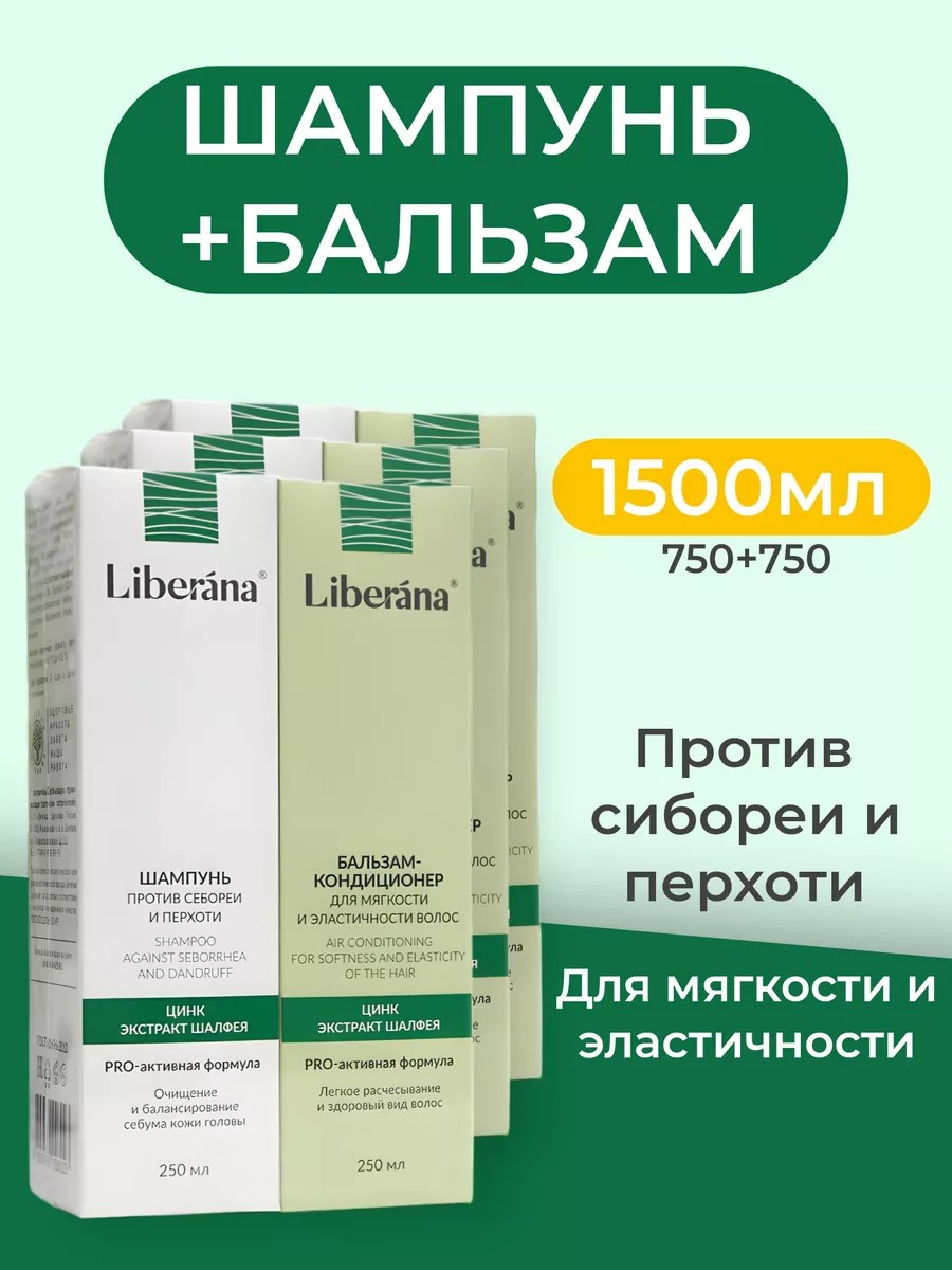 Шампунь против себореи и перхоти LIBERANA интенсивно очищает и нормализует работу сальных желез, способствует балансу себума. Цинк – эффективен в борьбе с перхотью, способствует устранению себореи. Экстракт шалфея – питает, укрепляет, придает мягкость и эластичность безжизненным и истонченным волосам. Подходит для ежедневного применения. Для наилучшего результата рекомендуется использовать в паре бальзамом-кондиционером для мягкости и эластичности волос LIBERANA. Бальзам-кондиционер для мягкости и эластичности волос LIBERANA делает волосы послушными, подготавливает их к укладке. Придает волосам мягкость, шелковистость и гладкость.