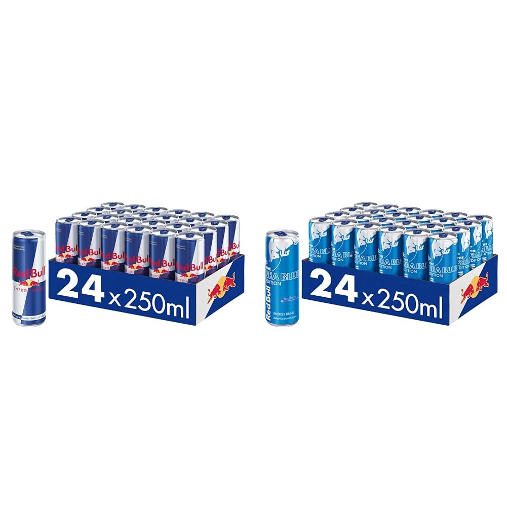 Red Bull gives wings (24 cans Red Bull Energy Drink and 24 Doses Red Bull Energy Drink Sea Blue Edition) 1987 was not only the market launch of a completely new product, but the birth of a completely new product category - Energy Drinks.Red Bull gives people and ideas wings and sets remarkable milestones in sports and culture. Consumption matters The drink was developed for times with increased effort and is estimated worldwide by top athletes, students, in highly demanding professions and on long car rides. Red Bull was the first brand in the Energy Drink category worldwide, which recognized and introduced the desire of consumers for a sugar -free variant. ingredients Caffeine: Caffeine was already known to the ancient peoples.They won caffeine from natural sources such as tea, coffee, cocoa beans and the colanus and appreciated its stimulating effect on the human body. Taurin: Taurin is an amino acid that occurs in the human body and in daily food.It is involved in a variety of biological processes. B-complex vitamins: Vitamins are essential micronutrients that serve to maintain normal body functions.These B-complex vitamins contribute to a normal energy metabolism such as the assembly and dismantling of carbohydrates, protein, as well as a normal intellectual performance (pantothenic acid) and to reduce fatigue and exhaustion (niacin, pantothenic acid, B6, B12).B-vitamins also play a central role in the brain.They contribute to a normal function of the nervous system.vitalizes body and mind.Scope of delivery: 1x cardboard Red Bull Energy Drink 24 x250ml 1x cardboard Red Bull Energy Drink Sea Blue Edition with 24 x 250ml.Red Bull doses are made of 100 recyclable aluminum.The amount of sugar in a 250ml can red bull energy drink is comparable to the amount of sugar in a corresponding amount of apple or orange juice- 11g per 100ml.A can 250ml Red Bull Energy Drink contains 80mg caffeine, about as much as in a cup of coffee.The special formula of the Red Bull Energy Drinks contains high quality ingredients: caffeine, taurine, vitamins of the B group, sugar, mountain water.The set consists of 2 trays: 1 x Red Bull Energy Drink 24x250ml and 1xred Bull Sea Blue Edition 24x250ml.RED BULL VERLEIHT FLÜGEL (24 Dosen Red Bull Energy Drink und 24 Dosen Red Bull Energy Drink Sea Blue Edition) 1987 war nicht nur die Markteinführung eines völlig neuen Produkts, sondern die Geburt einer völlig neuen Produktkategorie – Energy Drinks. Red Bull verleiht Menschen und Ideen Flügel und setzt bemerkenswerte Meilensteine in Sport und Kultur. Konsumgelegenheiten Das Getränk wurde entwickelt für Zeiten mit erhöhter Anstrengung und wird weltweit geschätzt von Spitzensportlern, Studenten, in stark fordernden Berufen sowie bei langen Autofahrten. Red Bull war weltweit die erste Marke in der Energy Drink Kategorie, welche den Wunsch der Konsumenten nach einer zuckerfreien Variante erkannte und führte Red Bull Sugarfree ein. Inhaltsstoffe Koffein: Koffein war bereits bei den antiken Völkern bekannt. Sie gewannen Koffein aus natürlichen Quellen wie Tee, Kaffee, Kakaobohnen und der Kolanuss und schätzten seine anregende Wirkung auf den menschlichen Körper. Taurin: Taurin ist eine Aminosäure, die im menschlichen Körper und in der täglichen Nahrung vorkommt. Es ist in einer Vielzahl von biologischen Prozessen involviert. B-Komplex-Vitamine: Vitamine sind essenzielle Mikronährstoffe, die der Aufrechterhaltung normaler Körperfunktionen dienen. Diese B-Komplex-Vitamine tragen zu einem normalen Energiestoffwechsel wie z.B. dem Auf- und Abbau von Kohlenhydraten, Eiweiß, sowie zu einer normalen geistigen Leistung (Pantothensäure) und zur Verringerung von Müdigkeit und Erschöpfung bei (Niacin, Pantothensäure, B6, B12). Darüber hinaus spielen B-Vitamine eine zentrale Rolle im Gehirn. Sie tragen zu einer normalen Funktion des Nervensystems bei.Vitalisiert Körper und Geist. Lieferumfang: 1x Karton Red Bull Energy Drink 24 x250ml 1x Karton Red Bull Energy Drink Sea Blue Editionmit 24 x 250ml. Red Bull Dosen bestehen aus 100 recycelbarem Aluminium. Die Zuckermenge in einer 250ml Dose Red Bull Energy Drinks ist vergleichbar mit der Zuckermenge in einer entsprechenden Menge Apfel- oder Orangensaft – 11g pro 100ml. Eine Dose 250ml Red Bull Energy Drink enthält 80mg Koffein, ungefähr so viel wie in einer Tasse Kaffee. Die spezielle Formel der Red Bull Energy Drinks enthält Zutaten von hoher Qualität: Koffein, Taurin, Vitamine der B-Gruppe, Zucker, Gebirgswasser. Das Set besteht aus 2 Trays: 1 x Red Bull Energy Drink 24x250ml und 1xRed Bull Sea Blue Edition 24x250ml.