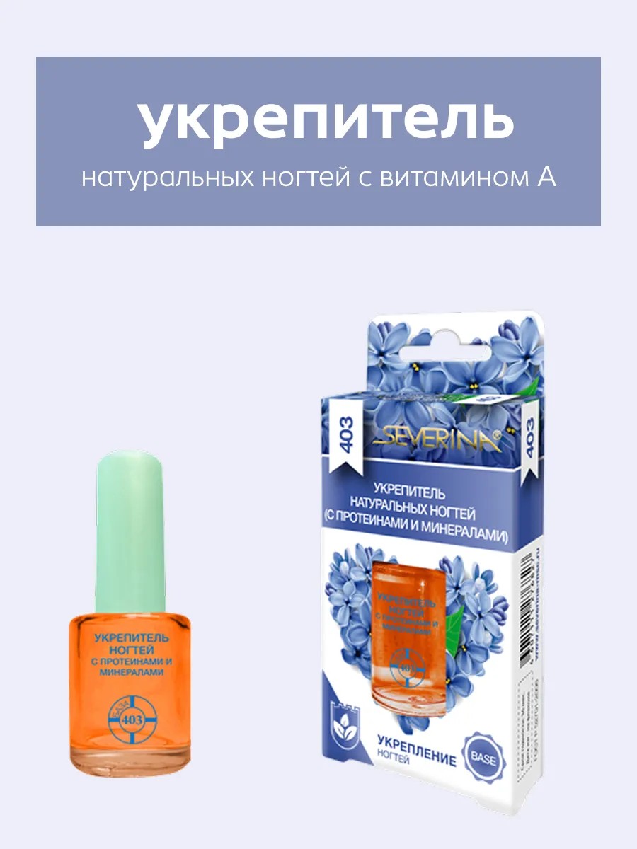 Severina №403 - Укрепитель натуральных ногтей (с протеином и минералами). Уникальный полимерный комплекс создаёт защитную плёнку, которая укрепляет тонкие и слабые ногти. Протеины и минералы активизируют процессы регенерации и стимулируют рост здоровых ногтей. Применение: наносят 1-2 слоя на чистые сухие ногти, в качестве основы под декоративный лак или как самостоятельное укрепляющее средство. Средство рекомендовано для частого использования.
