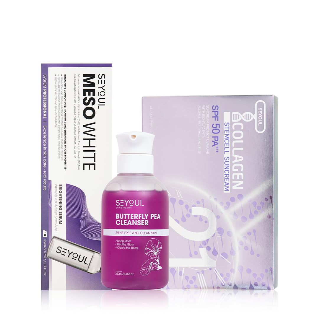 Experience the beauty of Korean skincare with the Seyoul 3-Step Radiant Glow Set, a complete daily routine to cleanse, renew, and protect your skin. Start with the Butterfly Pea Foaming Facial Cleanser, a gentle formula that deeply purifies without dryness. Follow with the MesoWhite Radiance-Boosting Serum, an advanced serum for face enriched with Niacinamide and Collagen to refine texture and promote a healthy glow. Finish your routine with the T-Collagen Sunscreen Serum SPF50 PA , a lightweight anti-aging serum and sunscreen for face that hydrates while shielding your skin from UV rays. This 3-step routine helps you achieve smooth, luminous, and balanced skin — the essence of K-beauty skincare.
