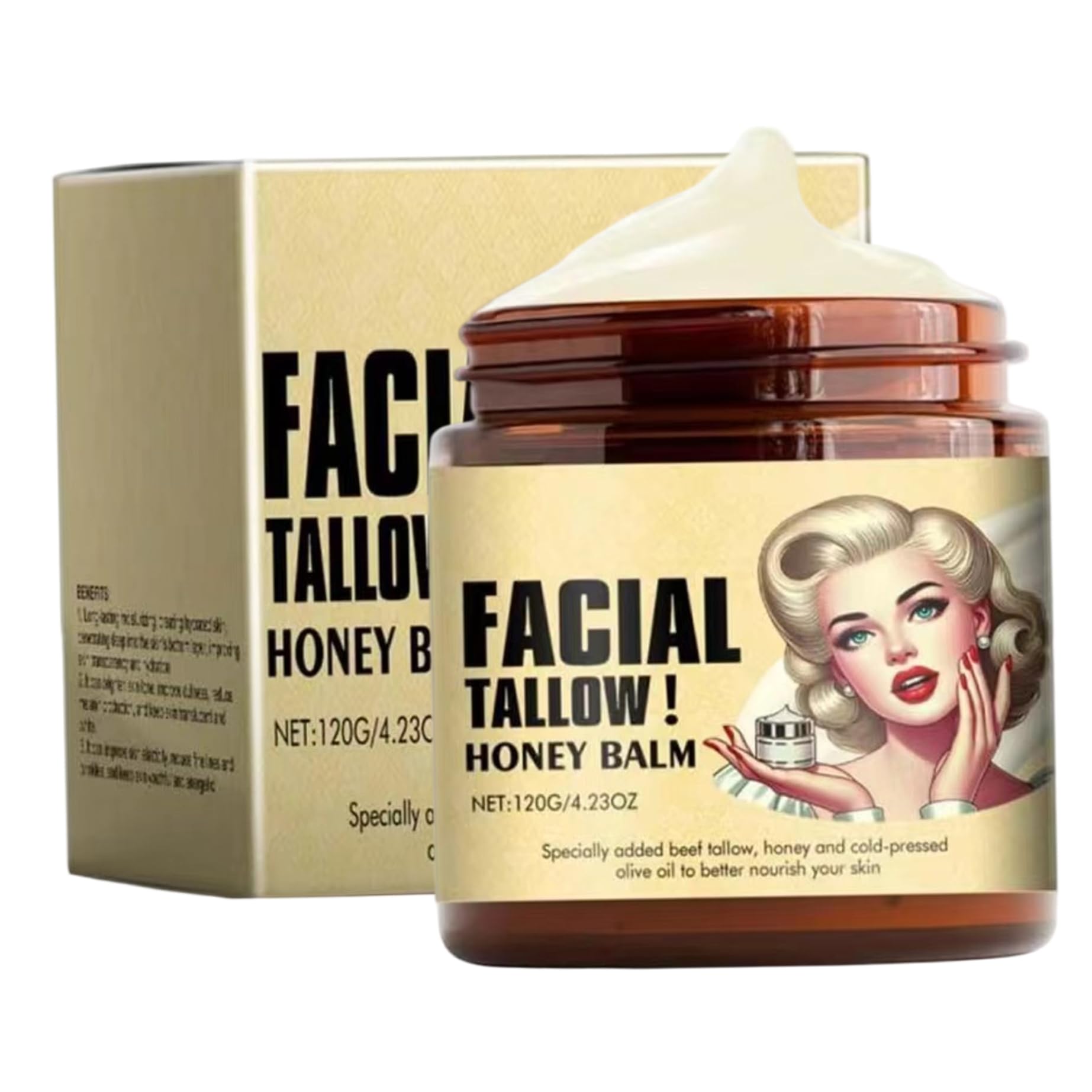 Discover the ultimate natural moisturizer with our Beef Tallow and Honey Balm. This 120g whipped cream deeply hydration through its nutrient-rich formula containing Vitamins D and E from beef tallow and honey. The airy texture applies smoothly without greess, making it perfect for facial and body use. As a multi-purpose balm, it serves as face cream, body moisturizer, hand treatments, and lip conditioner. The fragrance-free, essential oil-free formula makes it ideal for sensitive skin, eczema, and rosacea. Experience the difference of natural skincare that nourishes without irritation. Features: Whipped Tallow Honey Balm. -Size: Net content: 120g. Note: Manual measurement, please allow slight errors on size. The colors may exist slight difference due to different screens. Package Including 1 x Whipped Tallow Honey Balm