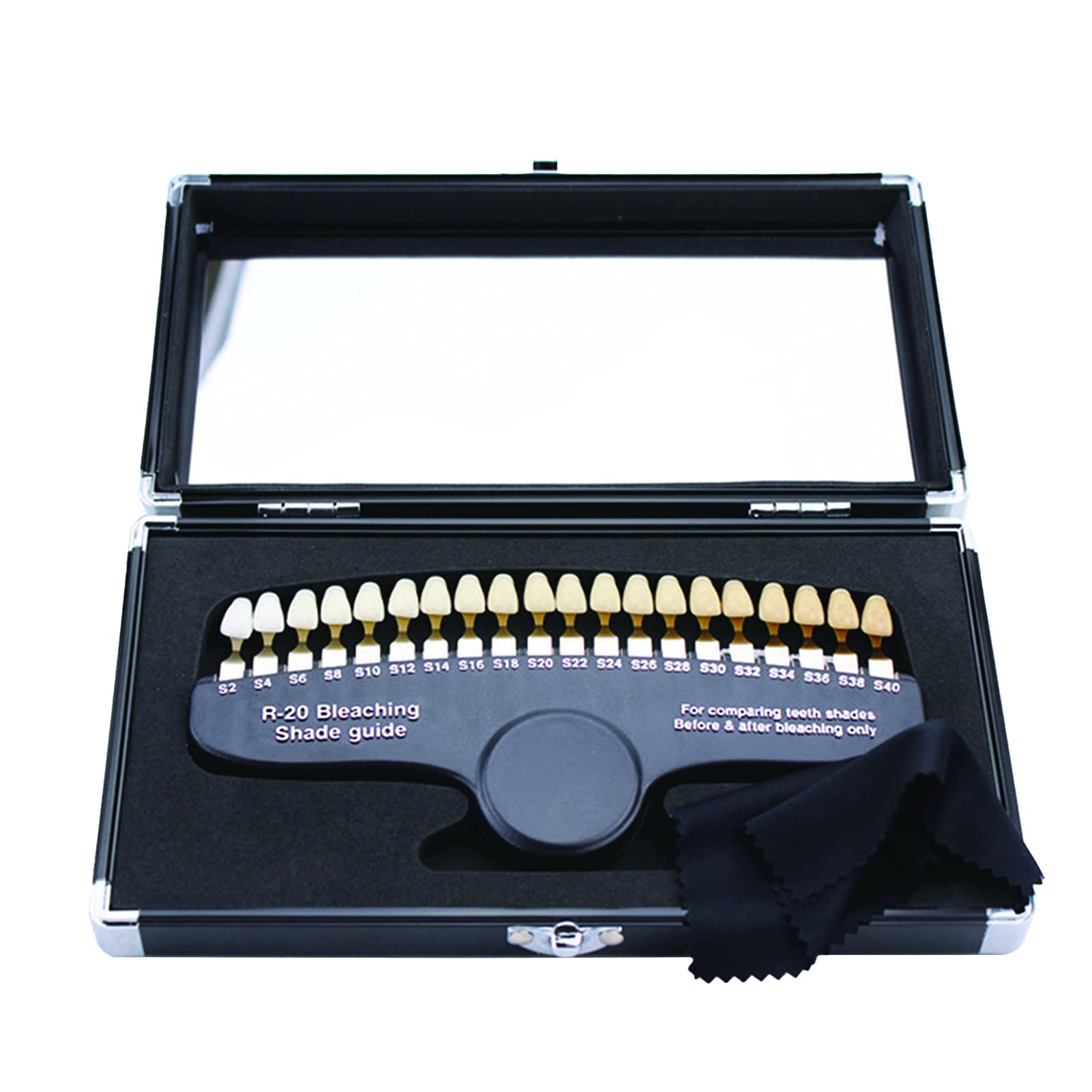 Each tooth can be removed individually, easy to clean and store.Comes with a stylish aluminum housing and a built -in mirror, portable and easy to wear.Professional tooth whitening paint for comparison before and after the tooth whitening.High quality 3D tooth color key made of porcelain, good for lightening the teeth and inserting an artificial tooth.20 colors, simple and clear, offer you a high accuracy of the tooth color.