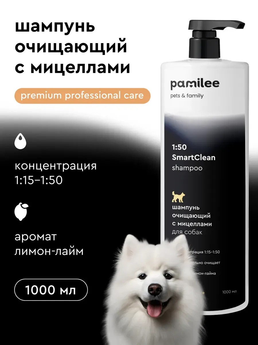 A shampoo for gentle yet thorough cleaning of even the most densely coated dogs. Pamilee Grooming's innovative formula, based on a unique combination of natural detergents from coconut oil and nourishing and moisturizing ingredients, helps gently remove dirt. Smart micelles in the shampoo selectively trap and carry away only oil and dirt particles with water, without affecting the natural lipids of the skin and hair, keeping the coat healthy. The shampoo adds natural shine and radiance to your pet's coat. It lathers well and imparts a light citrus scent. Contains natural ingredients. Ideal for all coat types. Non-toxic, does not irritate or dry out skin, coat, or hands, even with repeated use. Economical consumption. Safe for the environment.