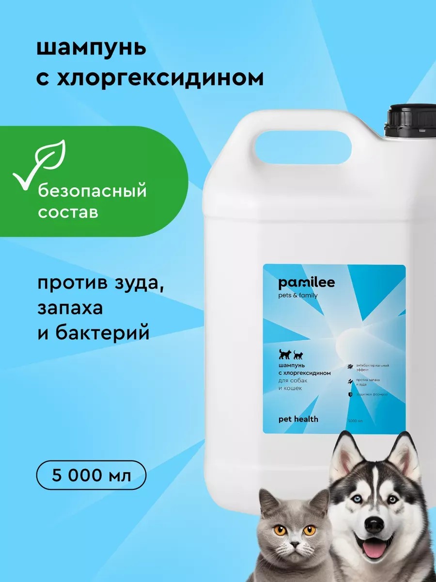 Шампунь Pamilee с хлоргексидином бережно очищает кожу и шерсть вашего питомца, оказывает антибактериальный эффект, препятствуя развитию патогенной флоры. Оптимальный уровень pH этого средства подходит для естественной кислотной среды кожи собак и кошек. Хлоргексидин, Д-пантенол и глицерин вместе создают защитную формулу → Сохраняют липидный покров, борются с зудом и запахом, ускоряют заживление ранок. После использования шампуня кожа вашего питомца будет здоровой, а шерсть ухоженной.Признайтесь, вы всегда мечтали об этом. Как применять? Применяйте шампунь только после назначения ветеринара. Нанесите небольшое количество шампуня на влажные руки, вспеньте, очистите образовавшейся пеной шерсть и кожу питомца, смоченные водой. После тщательно смойте пену теплой водой. Важно: избегайте попадания шампуня на слизистые и в уши. Если все же это произошло, то не волнуйтесь. Просто обильно промойте теплой чистой водой. Не применяйте шампунь при индивидуальной непереносимости компонентов продукта. Безопасный состав и упаковка. Подходит для любого типа шерсти, собачек и кошечек всех пород и размеров. Можно использовать для щенков и котят от 6 месяцев. Густая консистенция и удобный дозатор обеспечивают экономичный расход шампуня. Материал упаковки PET – используйте повторно либо сдайте на переработку.Шампунь безопасен для питомцев и окружающей среды. Не содержит SLS, спирта, парабенов, фталатов, формальдегида и его производных. От чистого сердца, команда Pamilee .