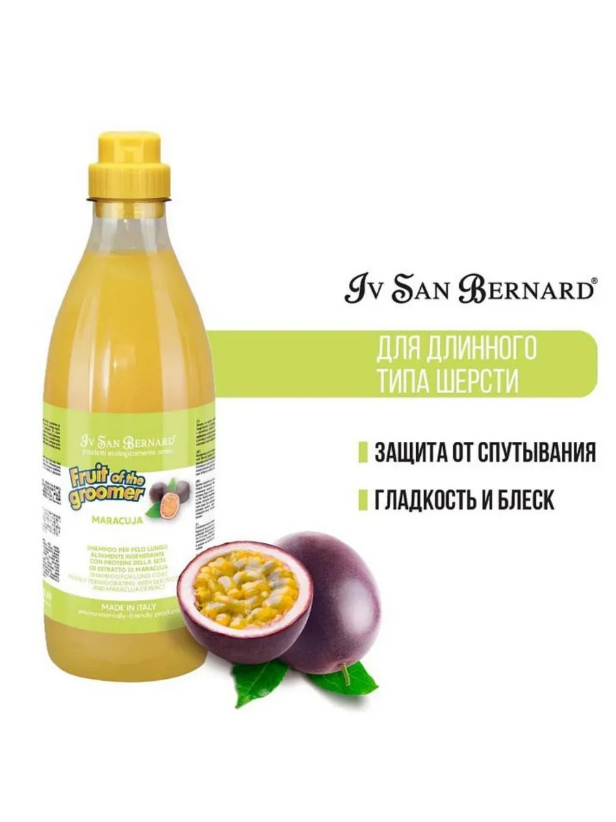 ISB Fruit of the Grommer Maracuja Shampoo for long hair with proteins 1 l (art. NSHAMA1000). : ISB Fruit of the Grommer Maracuja Shampoo for long hair with proteins 1 l The shampoo is designed for frequent use. Gives the coat silkiness, has a revitalizing effect. The beneficial properties of the active plant components of passion fruit are combined with the protective and strengthening effect of proteins. The fragrant aroma of passion fruit creates a pleasant mood for the animal and for you. How to use: Apply a sufficient amount of shampoo to well-wetted coat with massage movements. Leave on for 3 minutes, rinse with water. Repeat if necessary. For ease of use, you can dilute the shampoo with water 1:3. For the best effect, after shampooing, use the restorative mask "Passion Fruit with Proteins".