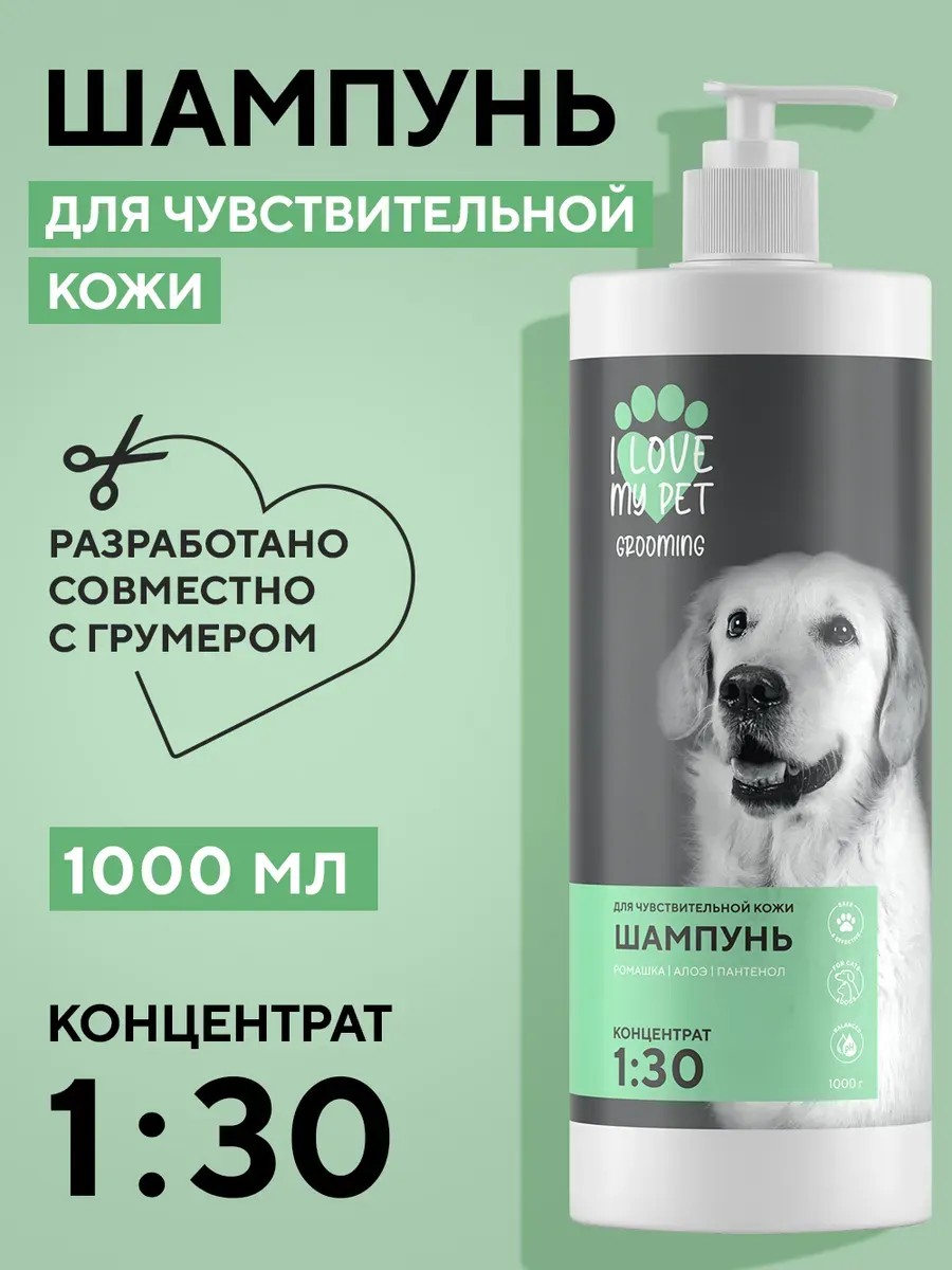 'Шампунь для животных с чувствительной кожей I LOVE MY PET. Концентрат 1:30. Средство с деликатной формулой бережно очищает кожу и шерсть кошек и собак, надежно устраняет неприятные запахи и придает свежесть. Способствует питанию и увлажнению шерсти, предотвращает спутывание.Экстракт ромашки уменьшает раздражения, а экстракт алоэ обеспечивает увлажнение. Пантенол облегчает распутывание шерсти. Подходит для ежедневного ухода. Благодаря сбалансированной формуле шампунь мягко очищает и не повреждает кожу. Подходит для щенков, котят и домашних животных с чувствительной кожей. Профессиональный шампунь обеспечит деликатный груминг собак и кошек разных пород - длинношерстных и короткошерстных. Средство подойдет для шерсти йорка (йоркширского терьера), чихуахуа, мопса, корги, болонки, лабрадора. Обеспечит гипоаллергенный уход для взрослых питомцев, котят и щенков..Шампунь дополнит набор грумеров, которым важно обеспечить своим четвероногим посетителям особенно мягкий и заботливый уход. Сочетание натуральных компонентов, проверенных на совместимость друг с другом и гипоаллергенность, помогут в этом. Экстракт ромашки и хлоргексидин окажут противогрибковый эффект, экстракт алоэ — увлажняющий, пантенол обеспечит более легкое расчесывание и распутывание колтунов. Шампунь поможет создать защиту от зуда и перхоти, избавит от неприятного запаха. Благодаря сбалансированной формуле средство мягко очищает и не повреждает кожу во время мытья. Зоотовары от I LOVE MY PET помогут грумерам раскрыть грани своего мастерства еще ярче и обеспечить питомцам безупречный уход без аллергии и другого дискомфорта.