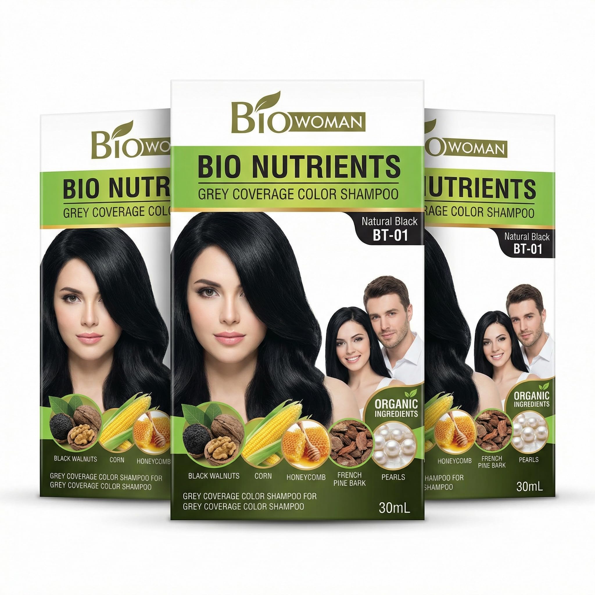 Shampooing Colorant Noir Anti-Cheveux Blancs Sans Ammoniaque - 3 Sachets x 30 ml (90 ml) Biowoman - Couvrance Rapide - Cheveux Brillants et Doux