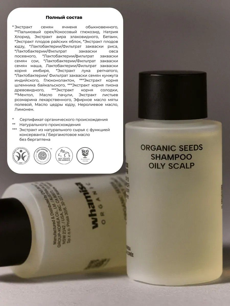 Этот шампунь содержит 67% органических ингредиентов и более 25 натуральных активных компонентов, которые бережно очищают волосы и жирную кожу головы. Он устраняет излишнюю жирность, маслянистый блеск, восстанавливает здоровый вид и придает волосам красоту. Уникальная органическая основа шампуня в сочетании с комплексом экстрактов риса, сои и овса, пройденных процесс ферментации, нежно очищает, смягчает, устраняет зуд и воспаления, увлажняет и питает волосы и кожу головы. Экстракты шлемника байкальского и аира оказывают антимикробное, антибактериальное и антиоксидантное действие. Масло мяты и экстракт пиона придают ощущение свежести и обладают дезодорирующим эффектом. Масло камелии, экстракты розмарина и райских яблок глубоко питают, увлажняют, защищают и укрепляют волосы.