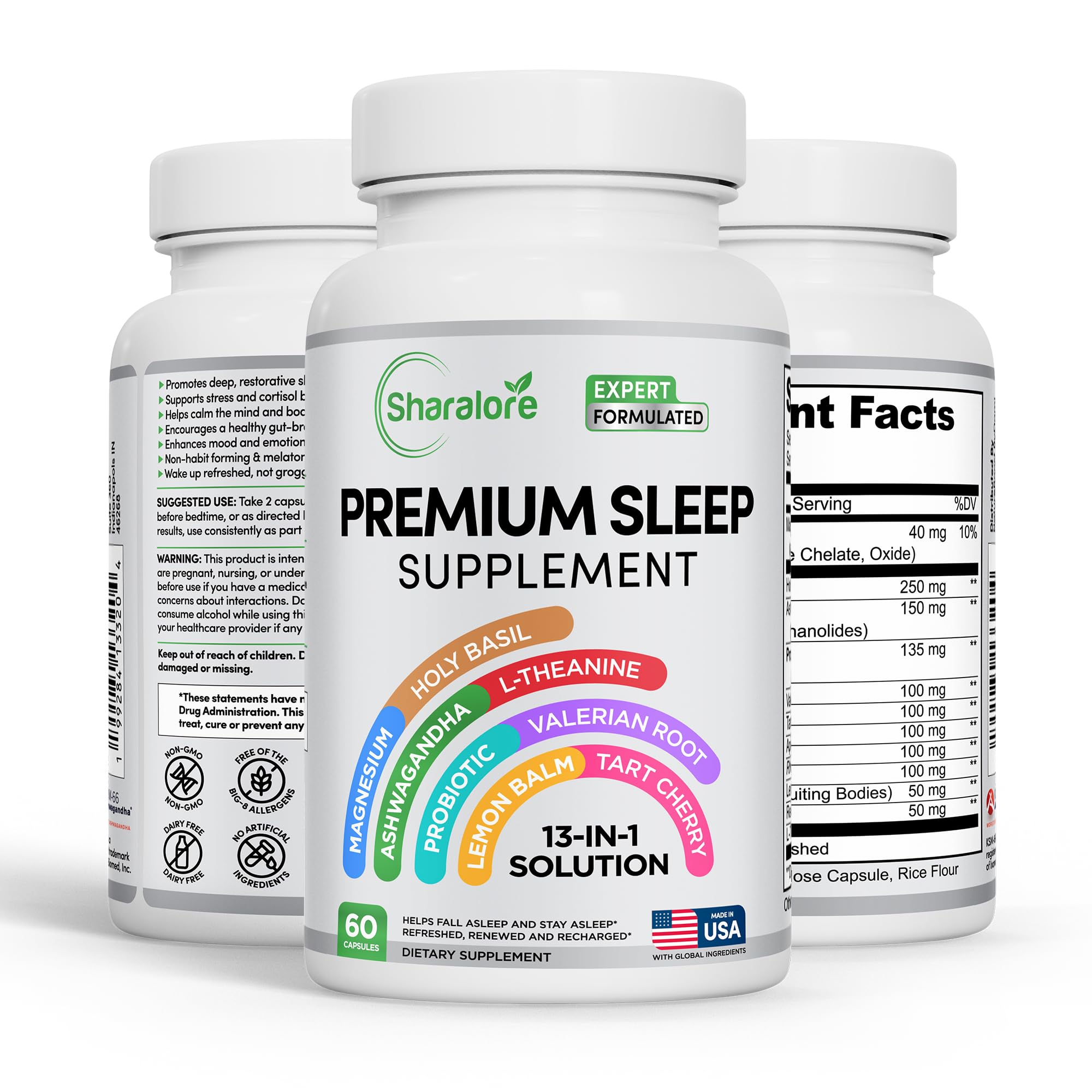 Sharalore 13-in-1 Natural Sleep Aid for Adults Melatonin-Free Premium Sleep Supplement with Magnesium Ashwagandha 5-HTP Valerian Root & Probiotics Non-Habit Forming 60 Capsules