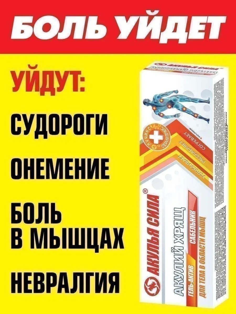 От боли в мышцах Гель Акулий хрящ Сабельник от судорог от онемения от невралгии. Крем от мышечных спазмов, невралгии, судорог, ишиаса, онемения и спазмов, За счет входящих в состав муравьиной кислоты эфирных масел и камфары, гель оказывает согревающий эффект, успешно справляется с мышечным болями, невралгией, судорогами, онемением, спазмами и растяжением связок. Хондроитин из акульих хрящей и сабельник активизируют процесс регенерации околосуставных тканей и выработку собственного коллагена, придают прочность и эластичность тканевым соединениям, нормализуют их работу. Гель-актив рекомендуется применять для разогрева и снятия боли и напряжения в области мышц, в том числе при больших физических нагрузках и занятиях спортом. Разогревающая мазь Акулий хрящ достойно заменит или дополнит препараты для связок и суставов: хондропротекторы, Бады и уколы. Можно использовать как крем для тела, крем для рук, крем для ног. Способ применения: наносить на проблемный участок 2-3 раза в день. Внимание: крем содержит натуральные компоненты с местно-раздражающим действием, которые могут вызвать покраснение, покалывание и чувство жжения. Этот эффект обеспечивает приток крови к месту нанесения, усиливает действие крема и обеспечивает лечебный и обезболивающий эффект. В зависимости от степени чувствительности кожи, данный эффект может держаться до получаса - часа.
