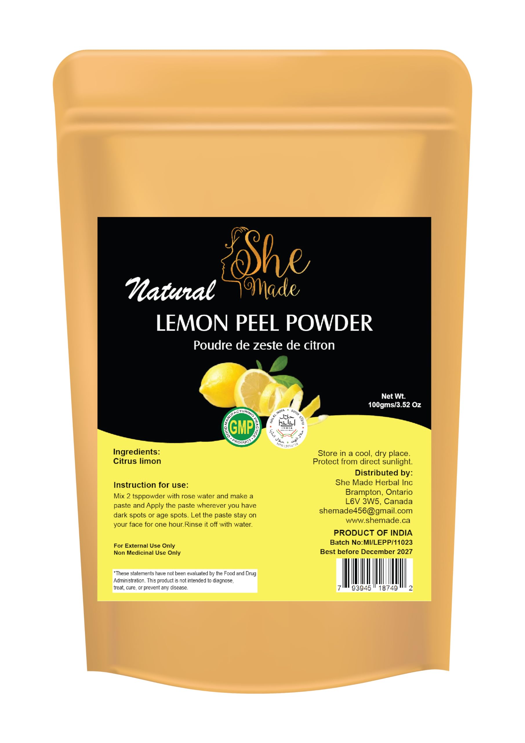 She Made Lemon Peel Powder For Skin Care | 100gms (3.52 Oz) | 100% Pure and Natural Lemon Peel Powder | No Added Preservative and Anti Tan Face Pack