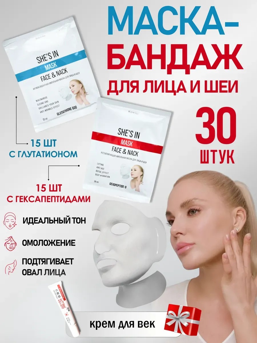 Набор масок для лица и шеи с пептидами и глутатионом 30 шт