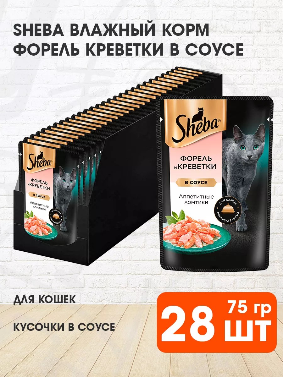 Корм Sheba для кошек влажный. Ломтики с нежной форелью и ароматными креветками в фирменном соусе - кошачий корм из высококачественных ингредиентов, который придётся по вкусу самым притязательным кошкам.