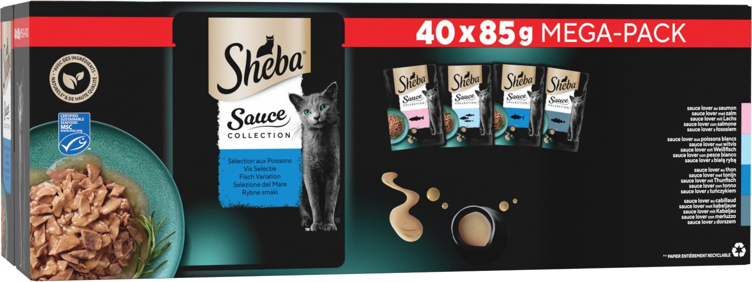 With this selection of SHEBA Selection fish bags for cats, please your feline! Offer him an exceptional and balanced culinary experience every day INGREDIENTS With salmon: Composition: meat and animal by-products (95 natural), fish and fish by-products (including salmon 4 in bites ), cereals, mineral substances, by-products of plant origin, vegetable protein extracts, sugars. Natural. Bouches representing 40 of the total product. With white fish: Composition: meat and animal by-products (95 natural), fish and fish by-products (including white fish 4 in bites ), cereals, mineral substances, by-products of plant origin, vegetable protein extracts, sugars. Natural. Bouches representing 40 of the total product. With tuna: Composition: meat and animal by-products (95 natural), fish and fish by-products (including 4 tuna in bites ), cereals, mineral substances, by-products of plant origin, vegetable protein extracts, sugars. Natural. Bouches representing 40 of the total product. With cod: Composition: meat and animal by-products (95 natural), fish and fish by-products (including cod 4 in bites ), cereals, mineral substances, by-products of plant origin, vegetable protein extracts, sugars. Natural. Bouches representing 40 of the total product. DIRECTIONS FOR USE A 3 kg cat needs 2 1 2 sachets - 3 1 2 sachets per day A 4 kg cat needs 3 1 2 sachets - 4 sachets per day A 5 kg cat needs 4 sachets - 4 1 2 sachets per day 1 sachet can be replaced by 16 - 18 g of kibble. Served in a convenient tray easy to open and serve. A delicious mix of cod, salmon, tuna, and white fish accompanied by a particularly generous portion of exquisite sauce. Made with fish from sustainable fisheries according to the MSC standard. No artificial colors or added preservatives. SHEBA adult wet cat food guarantees 100 complete and balanced high-quality meals for your favorite adult feline. Wet cat food in a succulent sauce prepared with natural and high-quality ingredients from trusted suppliers. Avec cette sélection de sachets pour chat SHEBA Sélection aux poissons faites plaisir à votre félin ! Offrez-lui chaque jour une expérience culinaire exceptionnelle et équilibrée INGRÉDIENTS Au saumon: Composition: viandes et sous-produits animaux (95 naturel), poissons et sous-produits de poissons (dont saumon 4 dans les bouchées ), céréales, substances minérales, sous-produits d'origine végétale, extraits de protéines végétales, sucres. Naturel. Bouchées représentant 40 de la totalité du produit. Aux poissons blancs: Composition: viandes et sous-produits animaux (95 naturel), poissons et sous-produits de poissons (dont poissons blancs 4 dans les bouchées ), céréales, substances minérales, sous-produits d'origine végétale, extraits de protéines végétales, sucres. Naturel. Bouchées représentant 40 de la totalité du produit. Au thon: Composition: viandes et sous-produits animaux (95 naturel), poissons et sous-produits de poissons (dont thon 4 dans les bouchées ), céréales, substances minérales, sous-produits d'origine végétale, extraits de protéines végétales, sucres. Naturel. Bouchées représentant 40 de la totalité du produit. Au cabillaud: Composition: viandes et sous-produits animaux (95 naturel), poissons et sous-produits de poissons (dont cabillaud 4 dans les bouchées ), céréales, substances minérales, sous-produits d'origine végétale, extraits de protéines végétales, sucres. Naturel. Bouchées représentant 40 de la totalité du produit. MODE D'EMPLOI Un chat de 3 kg a besoin de 2 sachets 1 2 - 3 sachets 1 2 par jour Un chat de 4 kg a besoin de 3 sachets 1 2 - 4 sachets par jour Un chat de 5 kg a besoin de 4 sachets - 4 sachets 1 2 par jour 1 sachet peut être remplacé par 16 - 18 g de croquettes. Servi dans une barquette pratique facile à ouvrir et à servir. Un délicieux mélange de cabillaud de saumon de thon et de poissons blancs accompagnés d'une portion de sauce exquise particulièrement généreuse Élaboré avec du poisson issu de pêche durable selon le référentiel MSC. Sans colorants artificiels ni conservateurs ajoutés. La nourriture humide pour chat adulte SHEBA garantit des repas 100 complets et équilibrés de haute qualité pour votre petit félin adulte préféré. Nourriture humide pour chat dans une succulente sauce préparée avec des ingrédients naturels et de haute qualité provenant de fournisseurs de confiance.