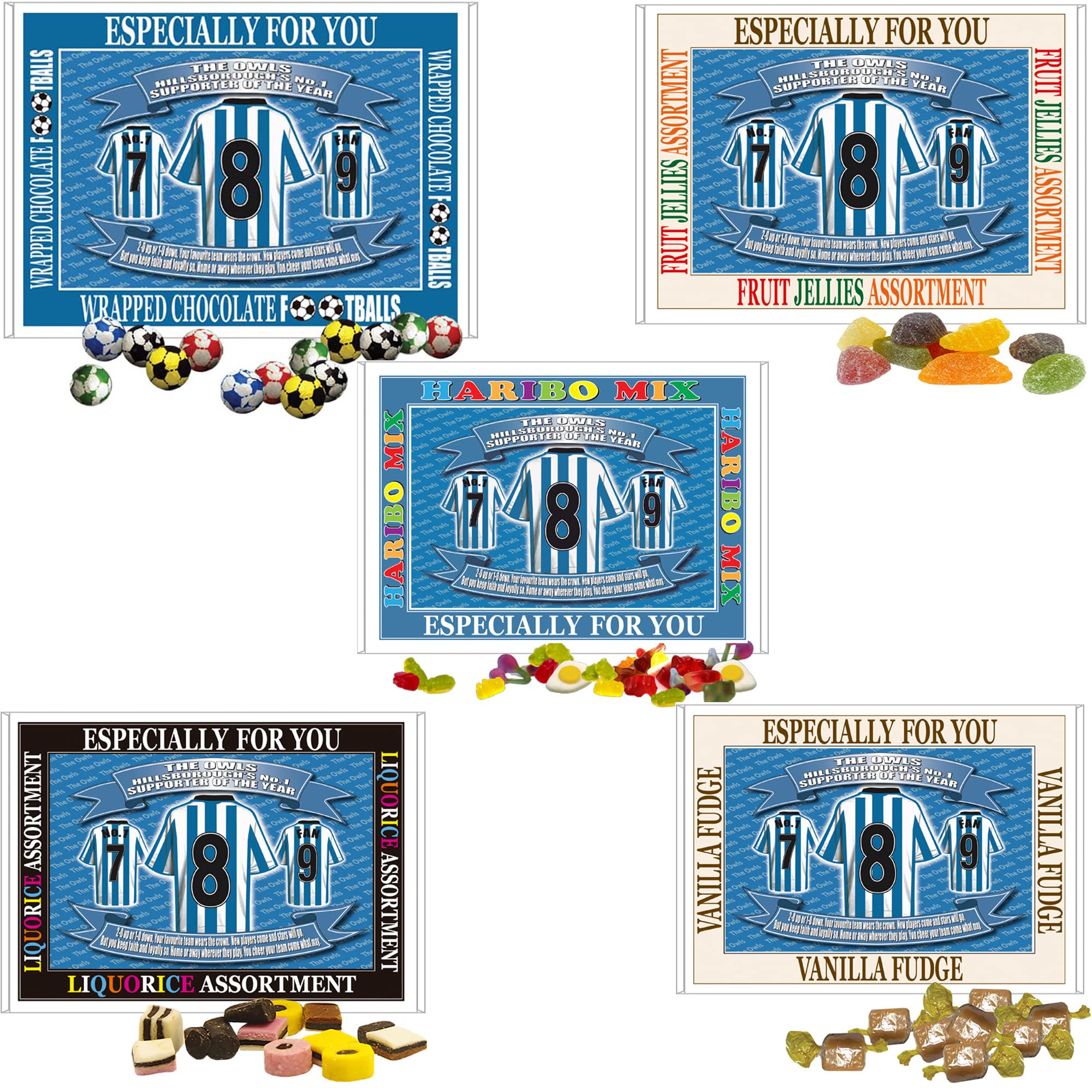 A perfect gift for any avid OWLS*FAN. Your favourite football team's shirt image printed onto a box lid containing 200g of your favourite sweets. Makes a unique, special collector's gift. Ingredients: LIQUORICE ASSORTMENT: Sugar, treacle, wheat flower*, glucose syrup, desiccated coconut, vegetable oil, beef gelatine, cornflower, humectant, glycerol, natural colours, plain caramel, beetroot red, curcumin, anthocyanins, capsanthin, fat-reduced cocoa powder, liquorice powder, flavourings, glazing agent. Fruit and vegetable concentrates: Blackurrant, carrot and radish. This product contains wheat. VANILLA FUDGE Assortment Sugar, glucose syrup, full cream condensed milk (milk; sugar), vegetable oils (palm kernel; palm stearin oil), butter (milk), salt, emulsifier: soya lecithin; flavourings. This product may contain egg and nut traces. FRUIT JELLIES ASSORTMENT: Sugar, glucose syrup, water, gelling agent, pectin; acid: lactic acid; flavourings. Colours: Anthocyanins. Chlorophylls, curcumin, capsanthin. This product may contain nuts, milk, sesame seeds and gluten. CHOCOLATE BALLS Ingredients: Sugar, vegetable oil (palm kernel), whey powder (milk), reduced fat cocoa powder, sorbitan tristearate, soya lecithin, natural bourbon vanilla. Allergens: Milk & Soya. FRUIT GUMMIES MIX Sugar, Glucose syrup, dextrose, spirulina, starch, gelatine, acid, citric acid, palm fat, watergelatine, caramelised sugar syrup, flavouring; fruit and plant concentrates; apple, aronia, blackcurrant, elderberry, grape, kiwi, lemon, mango, nettle, orange, carrot, passion fruit, spinach; glazing agents: beeswax carnauba wax, palm fat, water gelatine, colour: copper complexes to chlorophyll, invert sugar syrup; elderberry extract, carob extract. Any image or text displayed on this unofficial product has been independently produced and is in no way connected with, or endorsed by, the personalities, people, agents or organisations they may appear to depict.Manufactured in the UK. Supporting UK Small Businesses. Perfect Gift for Any Occasion. Choice Of Sweets.