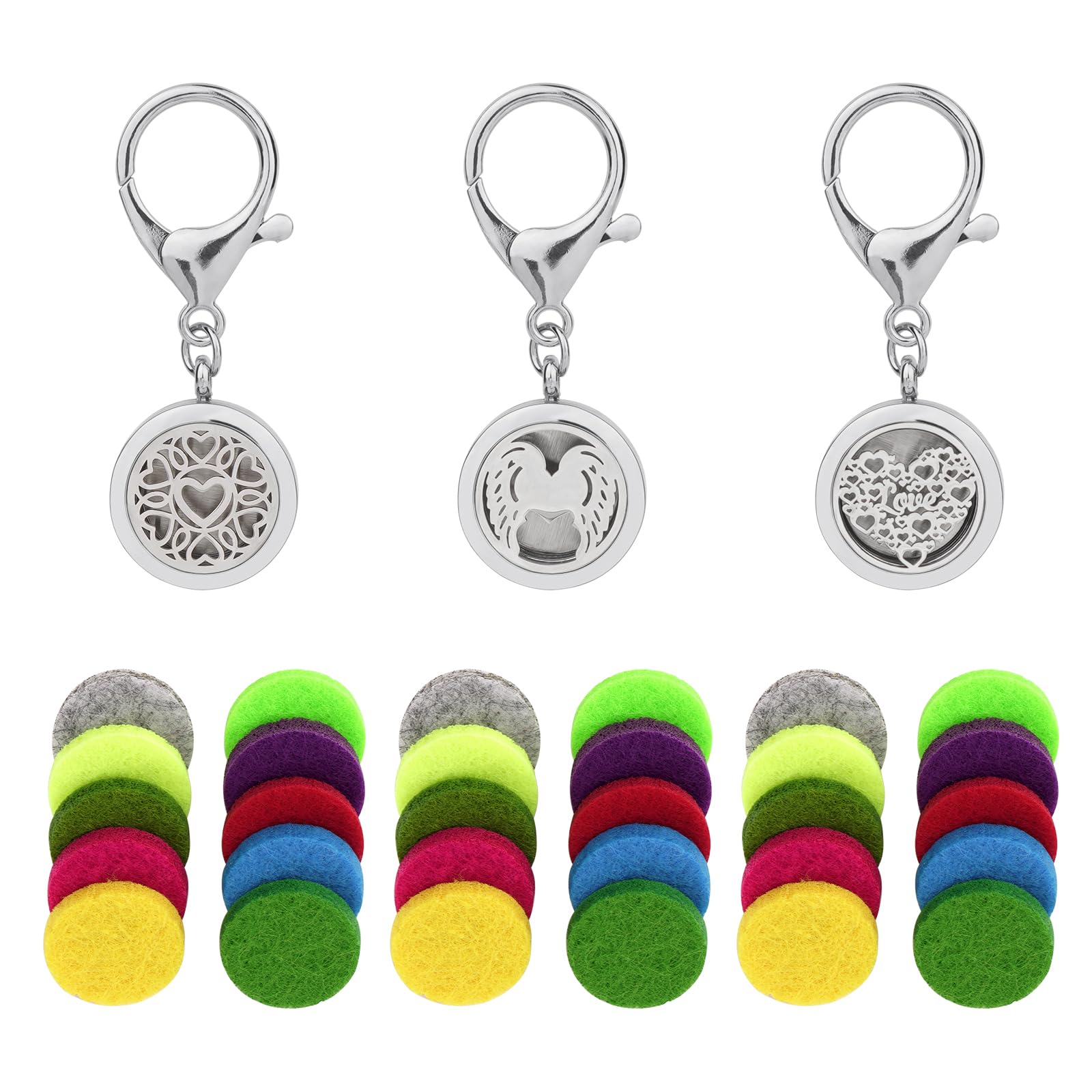Package content: 3 x Essential Oil Keychain (Silver) + 30 x Felt Pads (Multicolor). Essential Oil Diffuser Keychain dimensions: Keychain chain 4.5 cm/1.77" long, Round essential oil diffuser: 2.5 x 2.5 x 0.24 inches (L×W×H). Exquisite gifts: You can use these Essential Oil Diffuser Keychain set as gifts for your friends and family. Easy to use: 3-4 drops of essential oils needed on the pad, you can enjoy arome without touching your skin. This aromatherapy can Essential Oil Diffuser Keychain set. It is made of high quality alloy and is not easy to break. You can carry it for a long time.