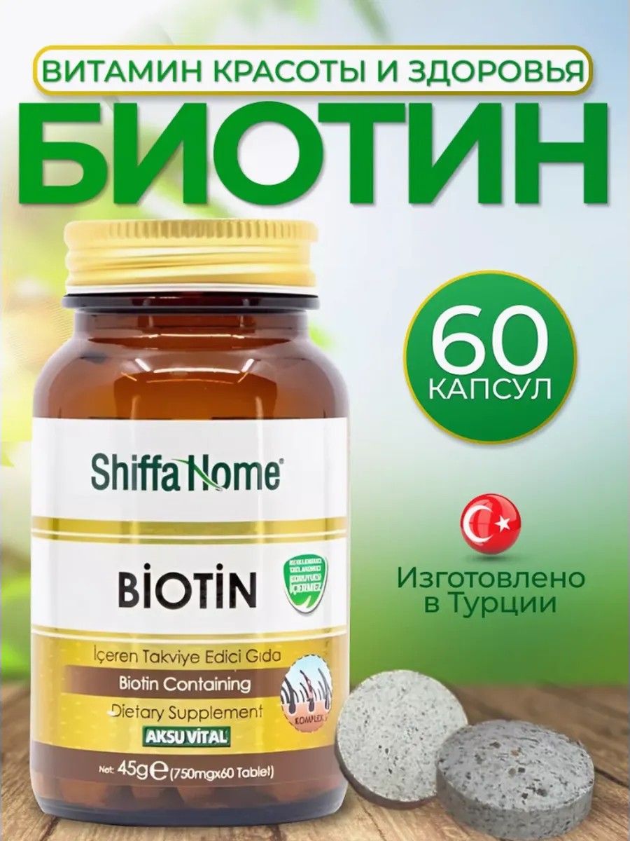 After using this vitamin complex, overall health improves, and immunity is boosted. It is used to improve women's well-being during menopause. Men take the supplement to increase testosterone levels, which has a positive effect on potency. It enhances the effects of nutrients such as calcium, omega-3 fatty acids, magnesium, and iron. Turkish vitamins are an excellent dietary supplement for maintaining youth. Each tablet contains 750 mg of the active ingredient, which is the optimal dosage for an adult. B7 has no contraindications and is suitable for children, adolescents, and pregnant and breastfeeding women. Give your hair silky smoothness with Shiffa Home! One bottle is enough for 30 days of use. Directions: Take 1 tablet 2 times daily at any time of day with plenty of water.