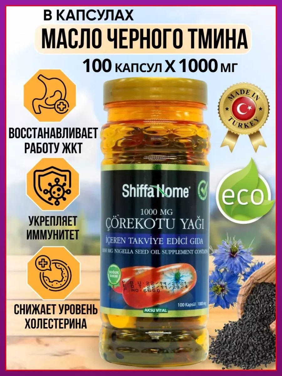 Масло черного тмина в капсулах 1000мг. от турецкого бренда Shiffa Home, производителя Бадов и питания для похудения.