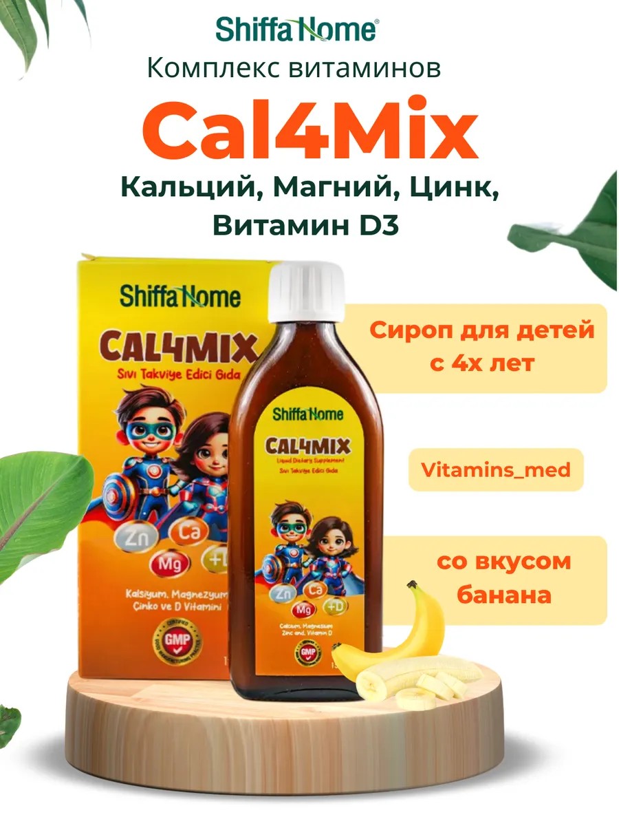 Витаминный коктейль Cal4Mix от SHIFFA HOME: здоровье в порядке!Растущий детский организм нуждается в особенной поддержке. Для этого турецкий бренд Shiffa home разработал мультивитаминный микс Cal4Mix. Это полноценный вкусный и полезный коктейль для прекрасного самочувствия, здорового роста.Cal4Mix это набор витаминов для развития костей у детей c 4 лет и старше!Состав комплекса по-настоящему богатый, и он идеально подходит для детей. Сироп способен восполнить дефицит кальция, витамина D, магния, цинка:· Кальций – это базовый «строительный материал» для костей и зубов.· Витамин D – идеальный катализатор усвоения кальция в детском организме, поэтому эти 2 компонента всегда «дружат» друг с другом.· Магний аналогично кальцию способен укреплять кости и участвовать почти в каждом метаболическом процессе, поэтому совместно принимая его с кальцием, вы сможете улучшить усвоение магния.· Цинк – обязательное условие для качественного роста и стабильного развития детского организма, что активно способствует правильному формированию хрящей и исключает процесс кальцификации мягких тканей.Для максимального удобства приема в комплекте в дополнение к стеклянной бутылочке (150 мл) идет специальная мерная ложечка.Применение:C 4-10 лет в день 1 мерная ложка (5мл).С 11 лет дважды в день по 5 мл.