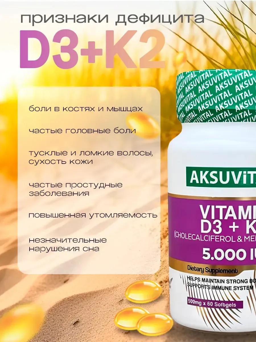 One capsule of D3K2 has the same effect as sunlight and mineral-rich foods. Cholecalciferol is used as a dietary supplement to support the immune system, muscles, and bones, normalize the nervous system (eliminates panic attacks, anxiety, tearfulness, irritability, and insomnia), and boost metabolism. Its advantages include: it is absorbed without loss in the gastrointestinal tract due to the gelatin shell, convenient administration – one capsule per day – regardless of diet or food composition. As a dietary supplement, it promotes smooth and stress-free weight loss by reducing cravings for sweets and improving endocrine and hormonal function, the dysfunction of which leads to excess weight gain in women. It helps the body more quickly absorb calcium, magnesium, collagen, omega-3, iron, and zinc. Recommended for the elderly, men and children, vegetarians, and athletes. It's also useful for arthritis, poor posture, diabetes, early menopause, and skin conditions. The complex helps with hair loss and is beneficial for the skin, nails, and joints.