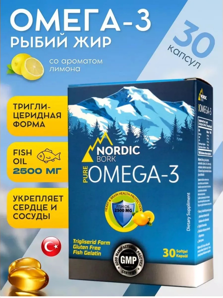 Omega-3 производство Турция бренда Nordic Bork - высококачественная пищевая добавка, полученная из мелких диких арктических рыбок, обитающих на атлантическом побережье Норвегии. Каждая капсула включает набор полезных элементов: рыбий жир, EHA (эйкозапентаеновую), DHA (докозагексаеновую) и другие жирные кислоты.